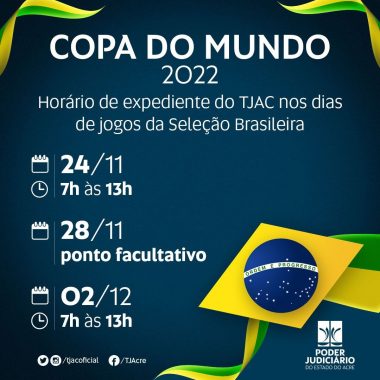 O Poder Judiciário do Acre terá horário de expediente em dias de jogos do Brasil na Copa. Portaria Nº 2624/2022, assinada pela desembargadora- presidente Waldirene Cordeiro, e publicada no Diário da Justiça Eletrônico desta sexta-feira, 17, estabelece a redução do horário de expediente em todas as unidades judiciárias e administrativas.