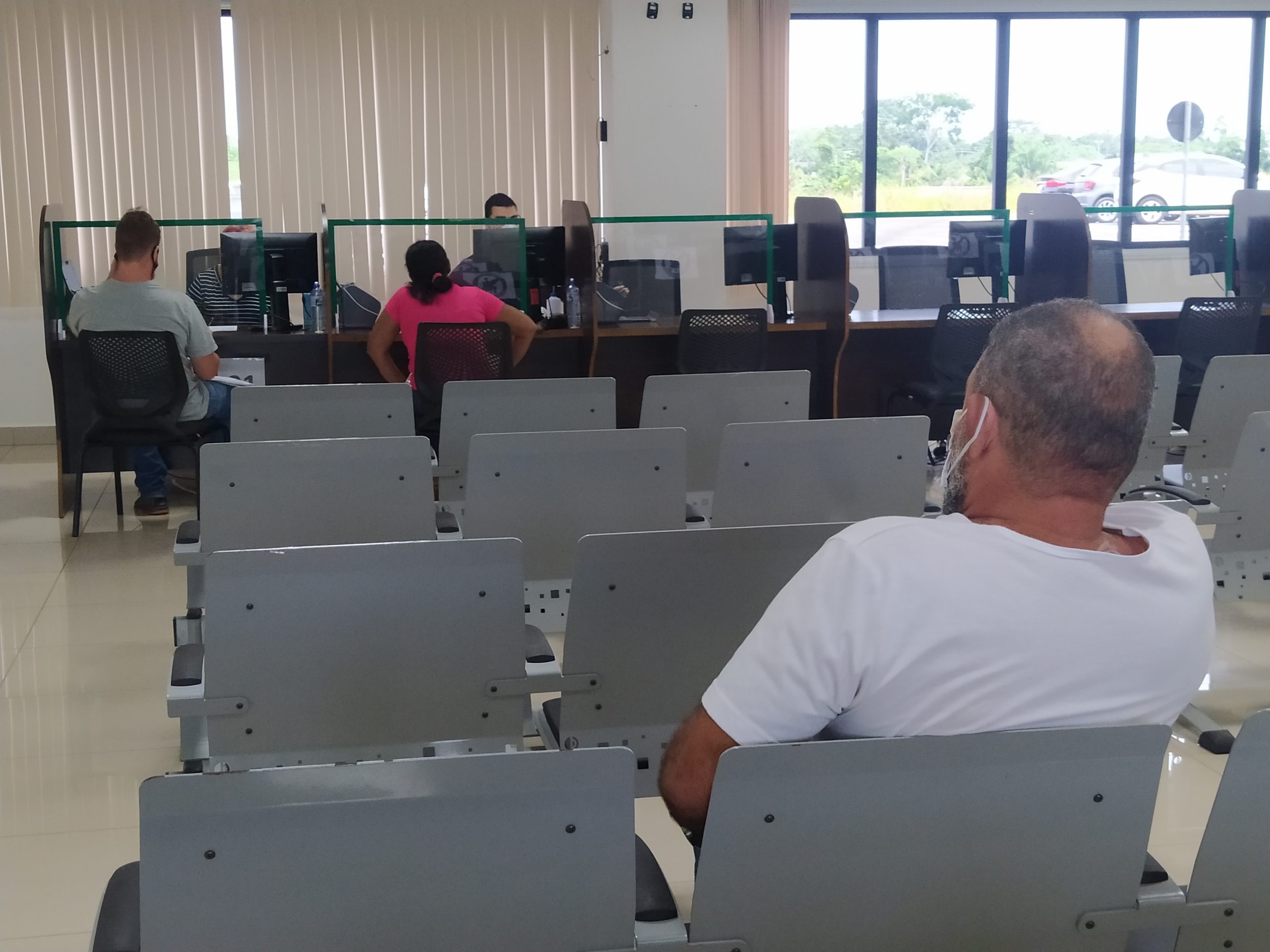 Na imagem é mostrado cadeiras da sala de espera com um homem sentado e ao fundo no balcão de informação dois servidores atendem duas pessoas