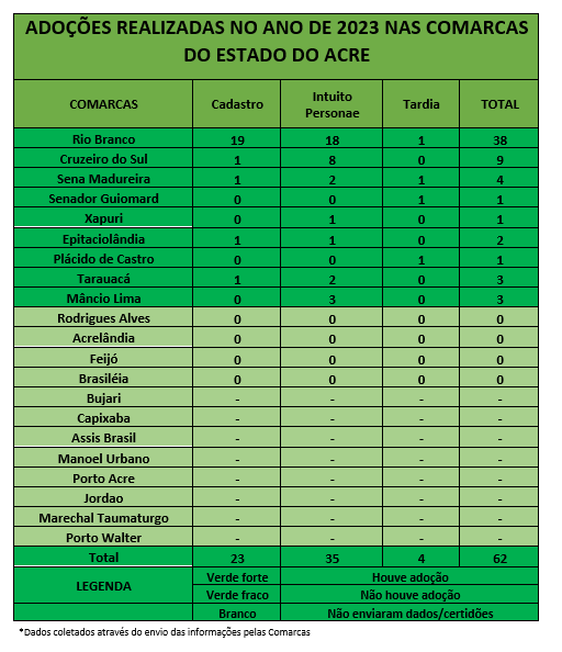 Os dados foram coletados pela Coordenadoria da Infância e Juventude (CIJ) do Tribunal de Justiça do Acre (TJAC), em cada uma das 22 comarcas do Poder Judiciário acreano e demonstram que a maior parte das adoções foi realizada na capital, um total de 38. O restante foi distribuído entre oito municípios: Cruzeiro do Sul, Sena Madureira, Senador Guiomard, Xapuri, Epitaciolândia, Plácido de Castro, Tarauacá e Mâncio Lima.