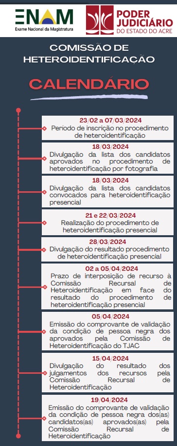 A Comissão de Heteroidentificação do Tribunal de Justiça do Acre (TJAC) organizou calendário com datas e prazos para pessoas inscritas no Exame Nacional da Magistratura (Enam) que se autodeclararam negras (pretas ou pardas).