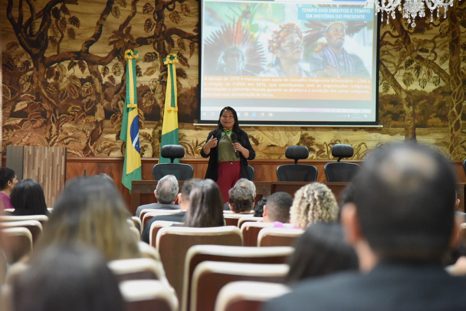 A secretária estadual Francisca Arara, discorreu no Painel II sobre o tema “História e Realidade dos Povos Indígenas no Acre”.