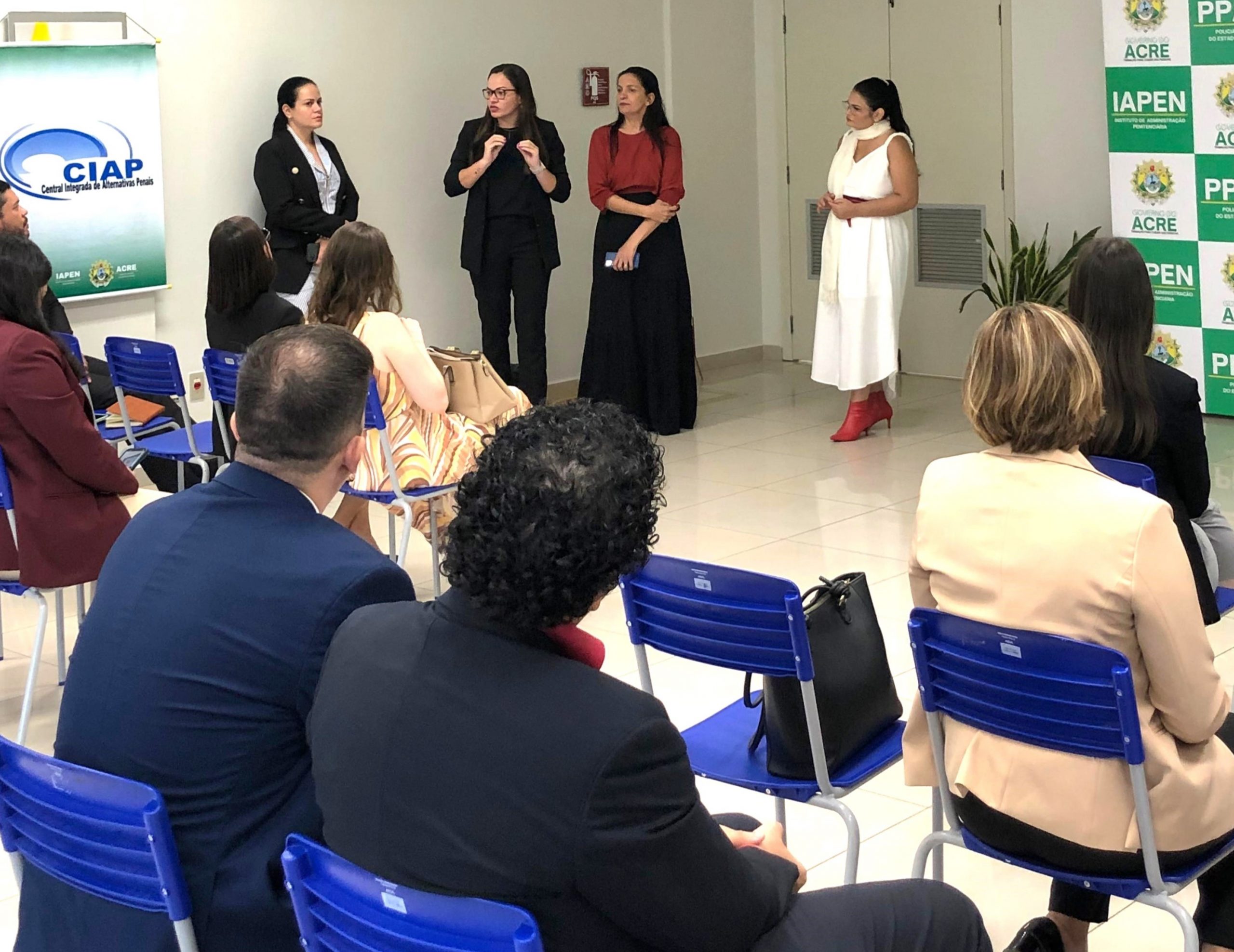 Na segunda visita foi ao Centro Integrado de Alternativas Penais (CIAP) do Iapen-AC, as magistradas e magistrados foram recepcionados pela chefe do Departamento de Assistência e Saúde, Ingrid Suarez e pela chefe da Divisão de Alternativas Penais e Atenção à Pessoa Egressa, Jandira Bandeira, para conhecer como funciona o atendimento na CIAP e o Escritório Social. Na ocasião, foram apresentados os espaços e fluxos de trabalho onde são realizados os grupos reflexivos e rodas de conversa, bem como o laboratório de informática para a realização de cursos para os cumpridores de penas alternativas.