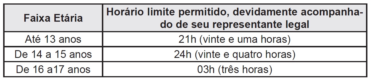 Ainda para essas duas cidades, na faixa etária de 14 a 15 anos, o limite de permanência nesses locais é até a meia-noite e, para jovens de 16 a 17 anos, a permanência é até às 3h. Entretanto, está escrito nas normatizações que mesmo acompanhado do responsável legal e dentro da faixa de horário permitida, fica proibido o acesso e a permanência de menores de 18 anos de idade em estabelecimentos que explorem jogos de bilhar, sinuca, congêneres ou casa de jogos, assim entendidas as que realizem apostas, ainda que eventualmente.