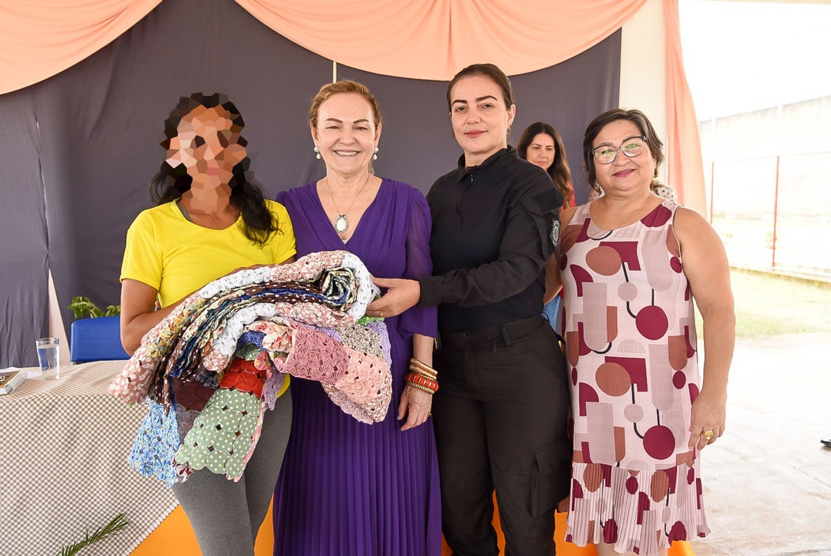 A presidente do Tribunal de Justiça do Acre (TJAC), desembargadora Regina Ferrari, acompanhada da coordenadora do Grupo de Monitoramento e Fiscalização do Sistema Carcerário do Acre (GMF) e titular Vara de Execuções Penais e Medidas Alternativas (Vepma), a juíza de Direito Andrea Brito, a reitora do Instituto Federal do Acre (Ifac), Rosana Cavalcante e a diretora da Unidade de Regime Fechado Feminina de Rio Branco (URF-F), Dalvani de Azevedo, encerraram nesta terça-feira, 26, a Oficina de Artesanato “Clube do Fuxico”, no Espaço de Convivência da URF-F, do presídio Francisco de Oliveira Conde, em Rio Branco.