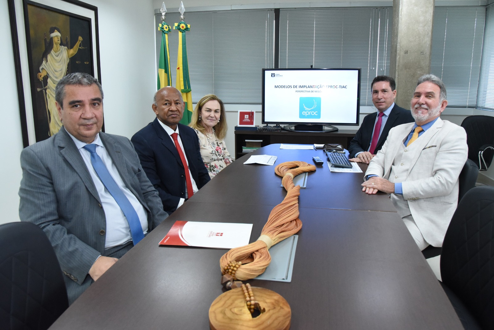 Nesta quinta-feira, 21, a presidente do TJAC, desembargadora Regina Ferrari, junto ao presidente do Comitê de Governança de Tecnologia da Informação (CGTIC), desembargador Laudivon Nogueira, o corregedor-geral da Justiça, desembargador Samoel Evangelista, o diretor da Escola do Poder Judiciário (Esjud), desembargador Elcio Mendes, e a equipe administrativa do tribunal, apresentou o projeto de implementação inicial do eproc.