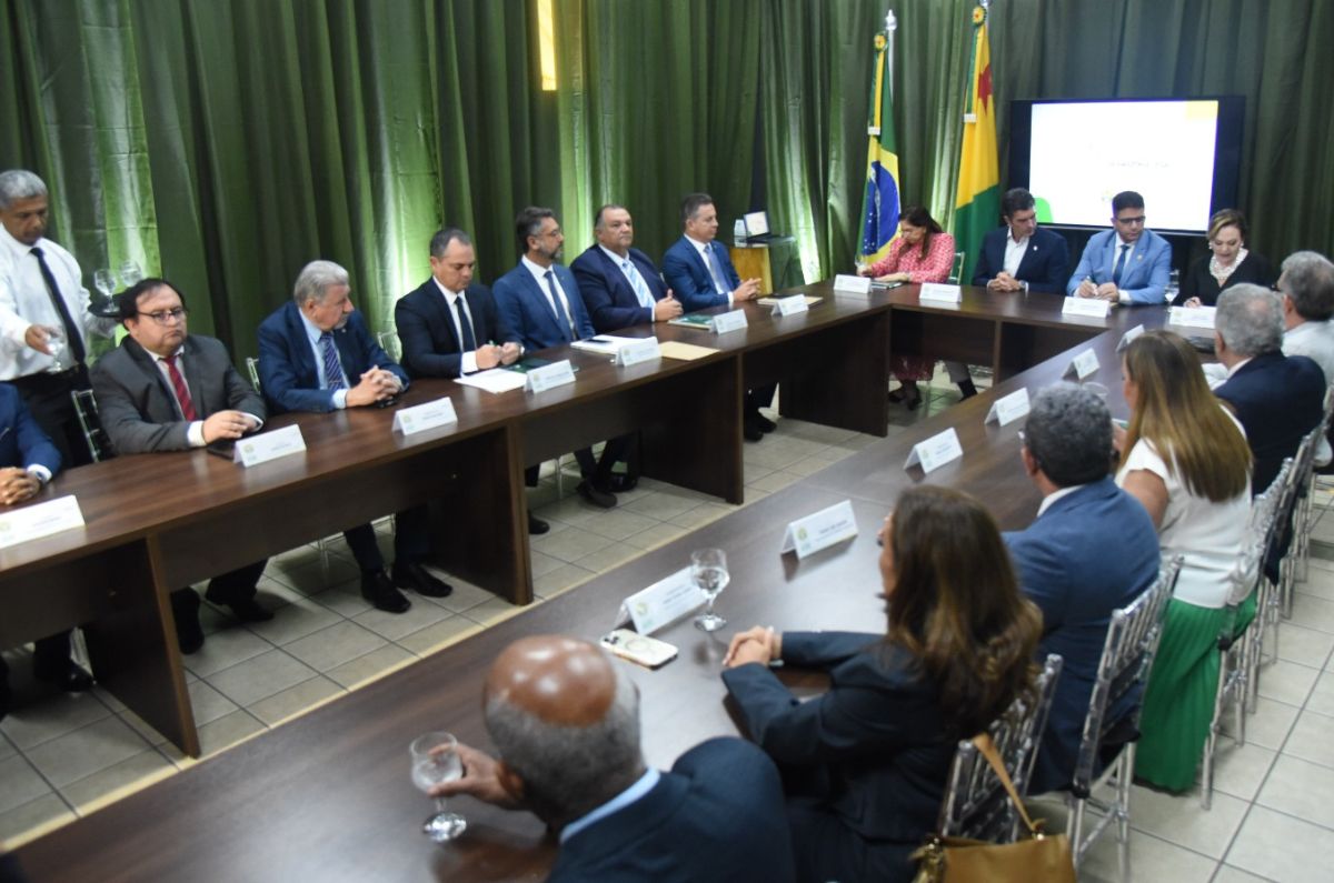 Iniciando o Encontro de Tribunais de Justiça da Amazônia Legal, nesta sexta-feira, 12, a presidente do Tribunal de Justiça do Acre (TJAC), Regina Ferrari, acompanhada de magistradas e magistrados dos Tribunais de Justiça do Pará, Mato Grosso, Amazonas, Tocantins, Amapá e da Corte Superior de Justiça de Madre de Dios, no Peru, e do Presidente do Tribunal Departamental de Justiça de Pando, Bolívia, dialogaram com os governadores da região Norte, reunidos em Rio Branco, no auditório do Detran, por ocasião do 27º Fórum de Governadores.