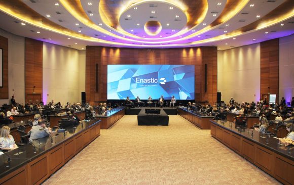 Os participantes do encontro puderam visitar a feira de tecnologia que apresentou as inovações dos patrocinadores do Enastic. Os stands foram montados no Foyer do décimo andar do Fórum Central, próximo ao plenário da abertura.