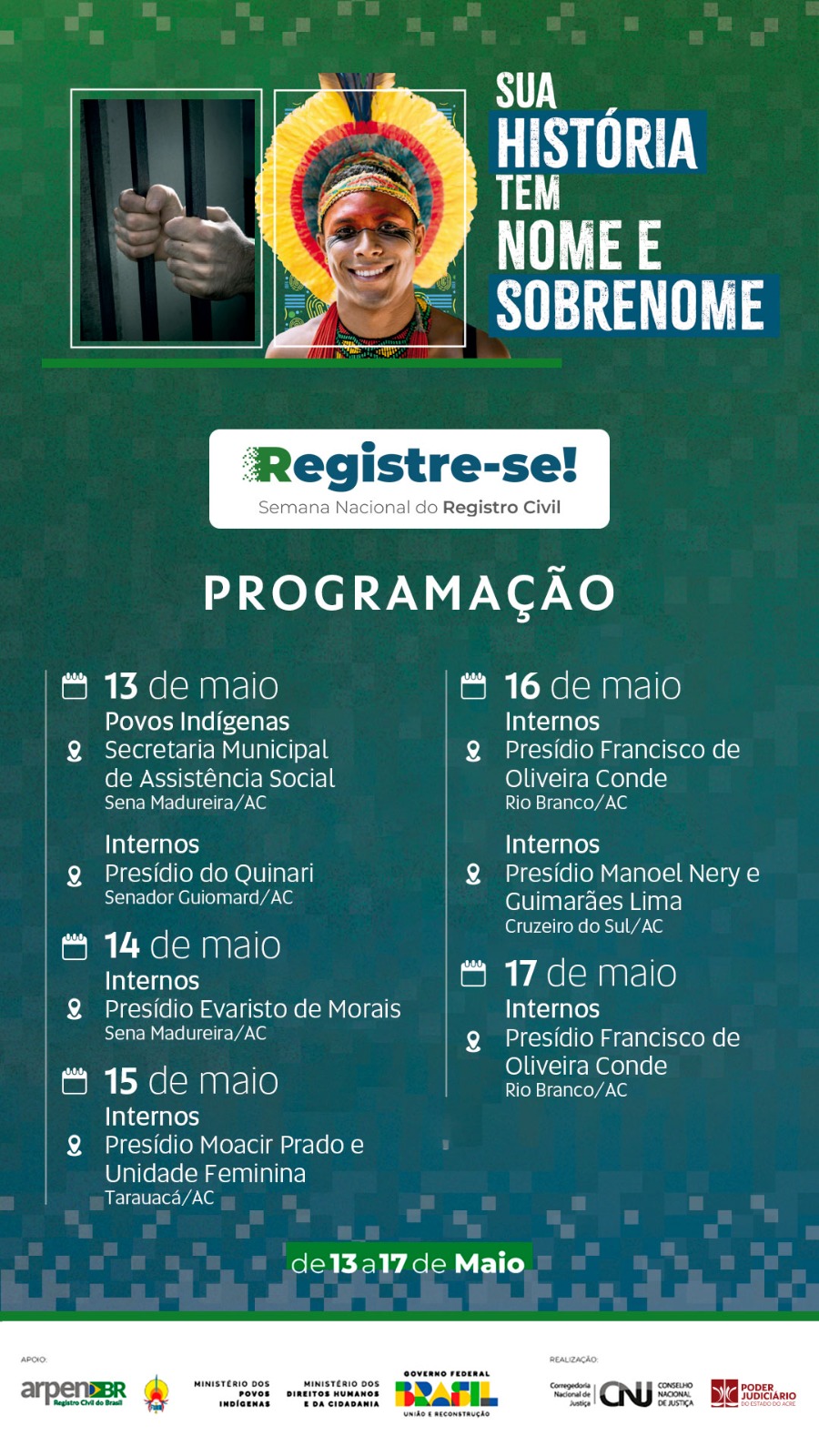 A 2ª edição da Semana Nacional de Registro Civil, “Registre-se”, do Conselho Nacional de Justiça (CNJ) atenderá indígenas e população encarcerada no Acre, entre os dias 13 a 17 maio, com emissão de documentos nas Unidades Penitenciárias do interior e capital.