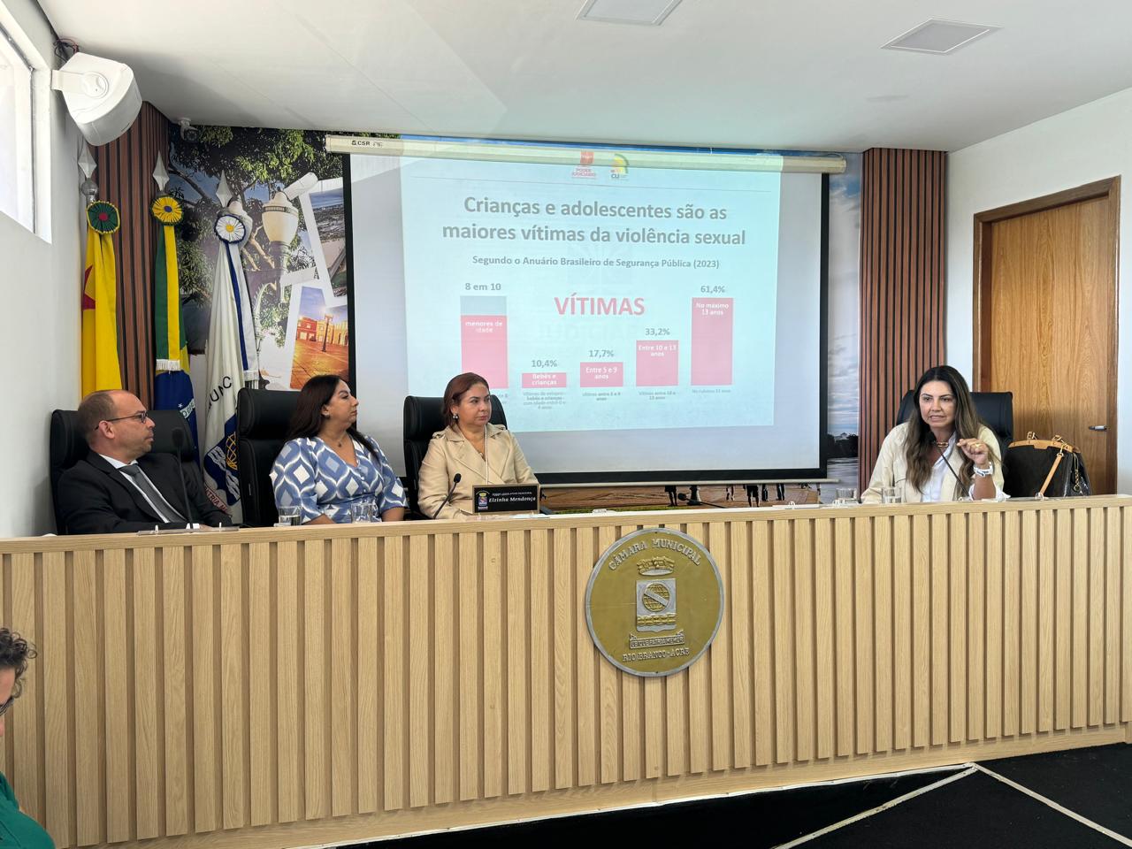 A juíza de Direito Andrea Brito fez a apresentação dos dados. O Anuário de Segurança Pública mostra que, em 2022, 60% dos casos de estupros no país, foram de crianças e adolescentes, sendo que a maioria das vítimas, 88,7%, são meninas, violentadas geralmente por pessoas do seu círculo de convivência, 82,7% dos abusadores são conhecidos das vítimas.