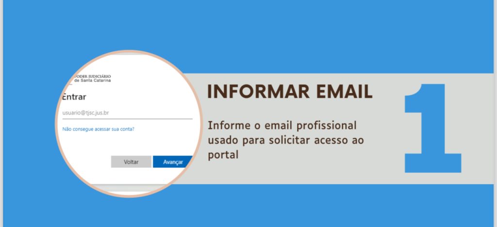 As(os) interessadas(os) receberão confirmação, solicitando que complete o cadastro e acesse o Portal do Conhecimento do TJSC. Veja o passo a passo abaixo, em cinco etapas:
