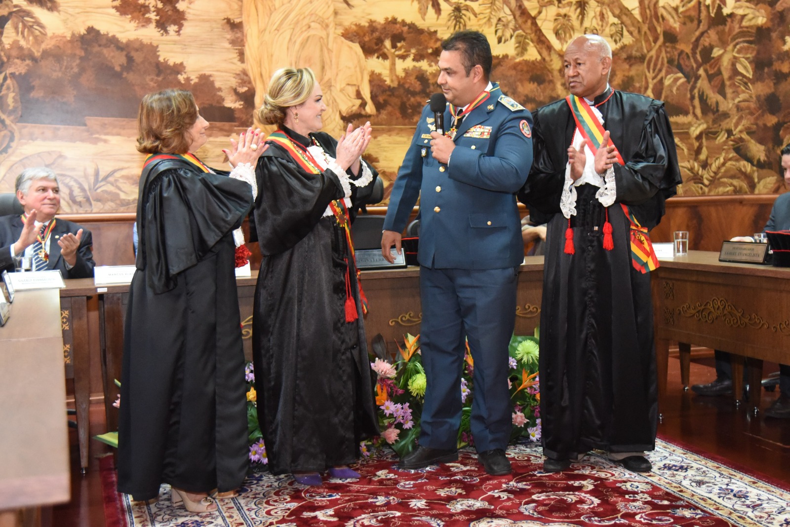 - No grau Grande Oficial, coronel Charles da Silva Santos: “Estou extremamente emocionado. Hoje é um momento ímpar na minha vida. Sou filho de José, o barbeiro que cortava o cabelo do doutor Djalma. Eu tive a oportunidade de ver o desembargador Samoel conquistando sua carreira, tive a oportunidade de ver a desembargadora Eva, estudando junto com seus filhos. Estou extremamente feliz, mais uma vez muito obrigada e podem contar conosco sempre”;