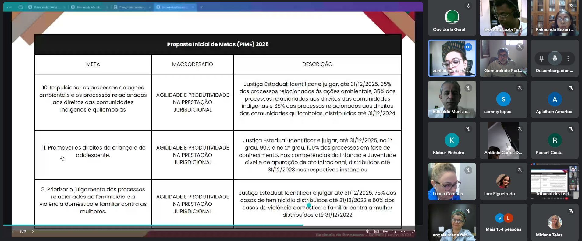 Para a Meta 6, sobre o julgamento de processos relacionados ao feminicídio e à violência doméstica e familiar contra as mulheres, o procurador de Justiça Sammy Barbosa propôs que além da meta quantitativa, houvesse uma descrição qualitativa com a prescrição de que esses julgamentos fossem adequados com os protocolos de perspectiva de gênero.