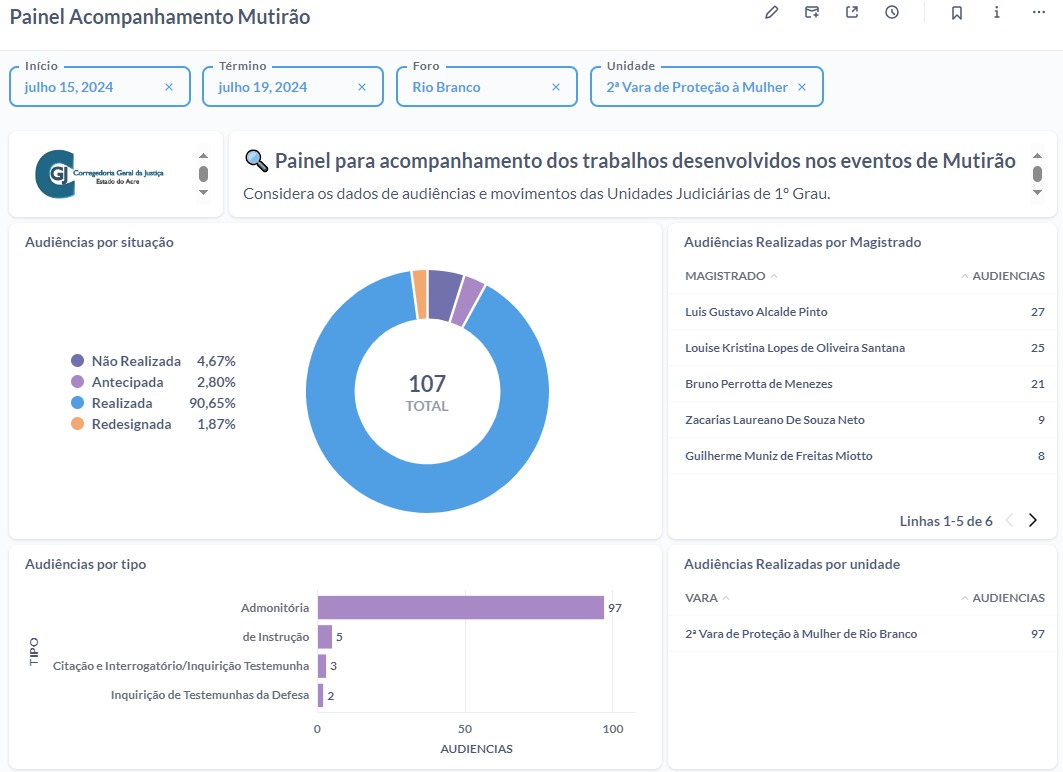 A concentração de audiências foi realizada entre os dias 15 a 19 de julho, com a participação das juízas de Direito titulares da 1ª e 2ª VPMRB, respectivamente Olívia Ribeiro e Louise Kristina, e mais 10 magistradas e magistrados, que estão no interior e acumularam os trabalhos para auxiliar, foram elas e eles: Bruno Perrotta, Caique Cirano, Gláucia Gomes, Guilherme Fraga, Guilherme Miotto, Luis Pinto, Luis Rosa, Marlon Machado, Vivian Yugar e Zacarias Laureano. Além disso, a ação teve o compromisso do Ministério Público do Estado do Acre (MPAC) e da Defensoria Pública estadual (DPE/AC).