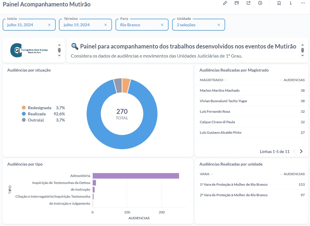 Durante os cinco dias estavam pautadas 270 audiências, tendo sido realizadas 92,59%. Dessa forma, quase todos os processos agendados tiveram a sentença dentro da própria audiência. O resultado representa o empenho do Judiciário do Acre no combate a essa forma de violência.