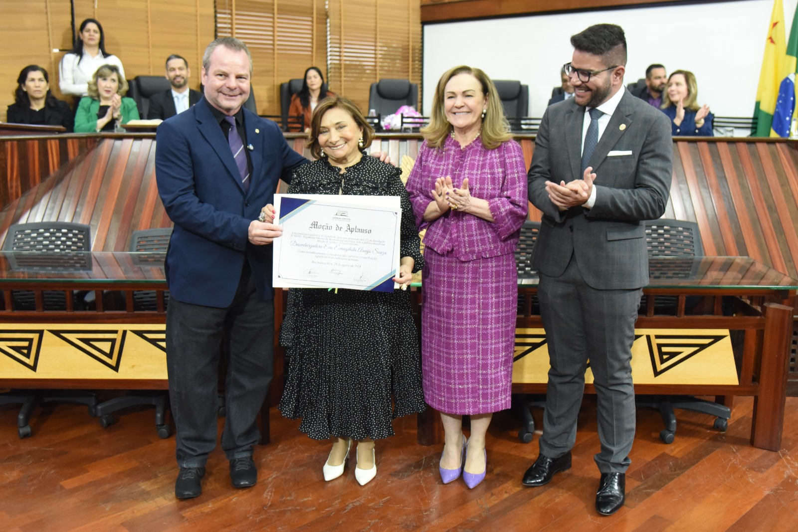“É uma honra e um privilégio pela significação histórica da homenagem prestada pela Assembleia Legislativa à minha pessoa, a primeira mulher desembargadora do Acre, em sessão solene, a requerimento do deputado Pedro Longo. Um sentimento de gratidão ao Parlamento Acreano pela homenagem, que agradeço a Deus pela vida e pela saúde. Compartilho com o Tribunal de Justiça, a magistratura, servidores, minha família e a população. Eu quero fazer essa reflexão sobre minha própria trajetória, mas como uma jornada que contou com o apoio de tantas pessoas, por tantas instituições e pela busca de resultados, os quais também agradeço tanto. Aqui eu conheço quase todos. Isso é um privilégio, com relações aprofundadas no ouvir o outro, que nos dá essa força extraordinária”, registrou a desembargadora homenageada.
