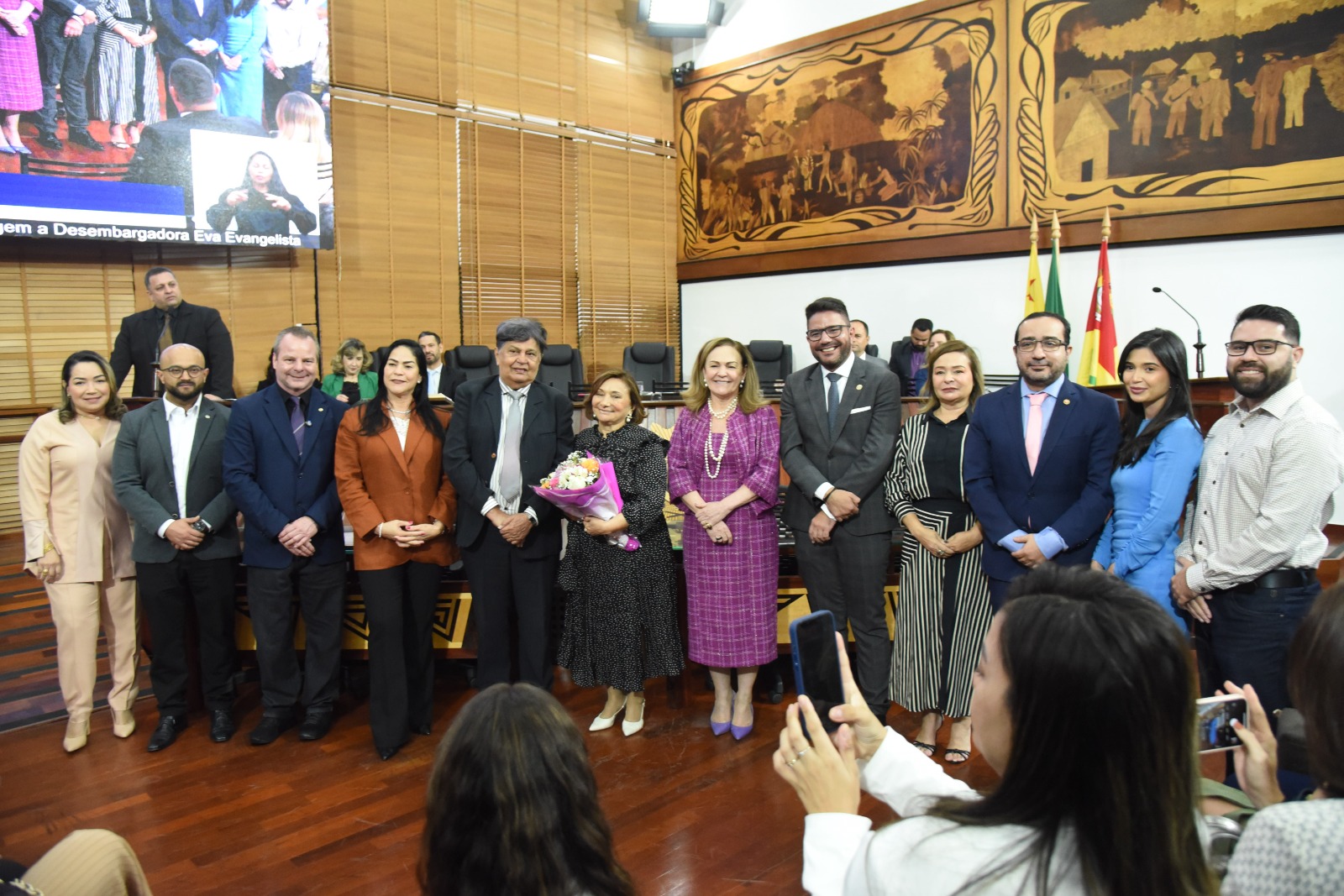 “A desembargadora Eva é uma pessoa que sempre me surpreende, porque ela tem uma capacidade (…) de se reinventar. (…) Sua missão vai muito além do seu trabalho nas câmaras, vai muito além daquelas atividades que são a sua obrigação judiciária, para se dedicar à nossa sociedade. Encampa projetos novos, encampa o projeto cidadão, está sempre presente nos municípios, nós (…) a encontramos rotineiramente nos mais distantes locais desse Acre conversando com as pessoas, perguntando como a Justiça pode se fazer mais efetiva – e sempre com grande maestria, apresentando resultados de forma rápida, efetiva, sem um reparo que se possa fazer ao longo de toda a sua vida pública. (…) Essa manhã é sua e a Assembleia Legislativa se orgulha de poder estar recebendo e fazendo este justo reconhecimento aos seus serviços prestados”, disse o deputado Pedro Longo.