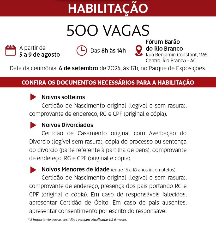 O Tribunal de Justiça do Acre (TJAC) informa que as inscrições para o Casamento Coletivo de Rio Branco foram prorrogadas. Para participar, é necessário comparecer das 8h às 14h ao Fórum Barão do Rio Branco, situado na Rua Benjamin Constant, n.º 1.165, bairro Centro.