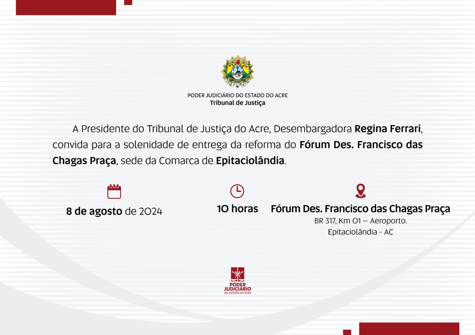 Amanhã, quinta-feira, 8, a presidente do Tribunal de Justiça do Acre (TJAC), desembargadora Regina Ferrari, realizará a entrega da reforma do Fórum Desembargadora Francisco das Chagas Praça, sede da Comarca de Epitaciolândia, às 10h.