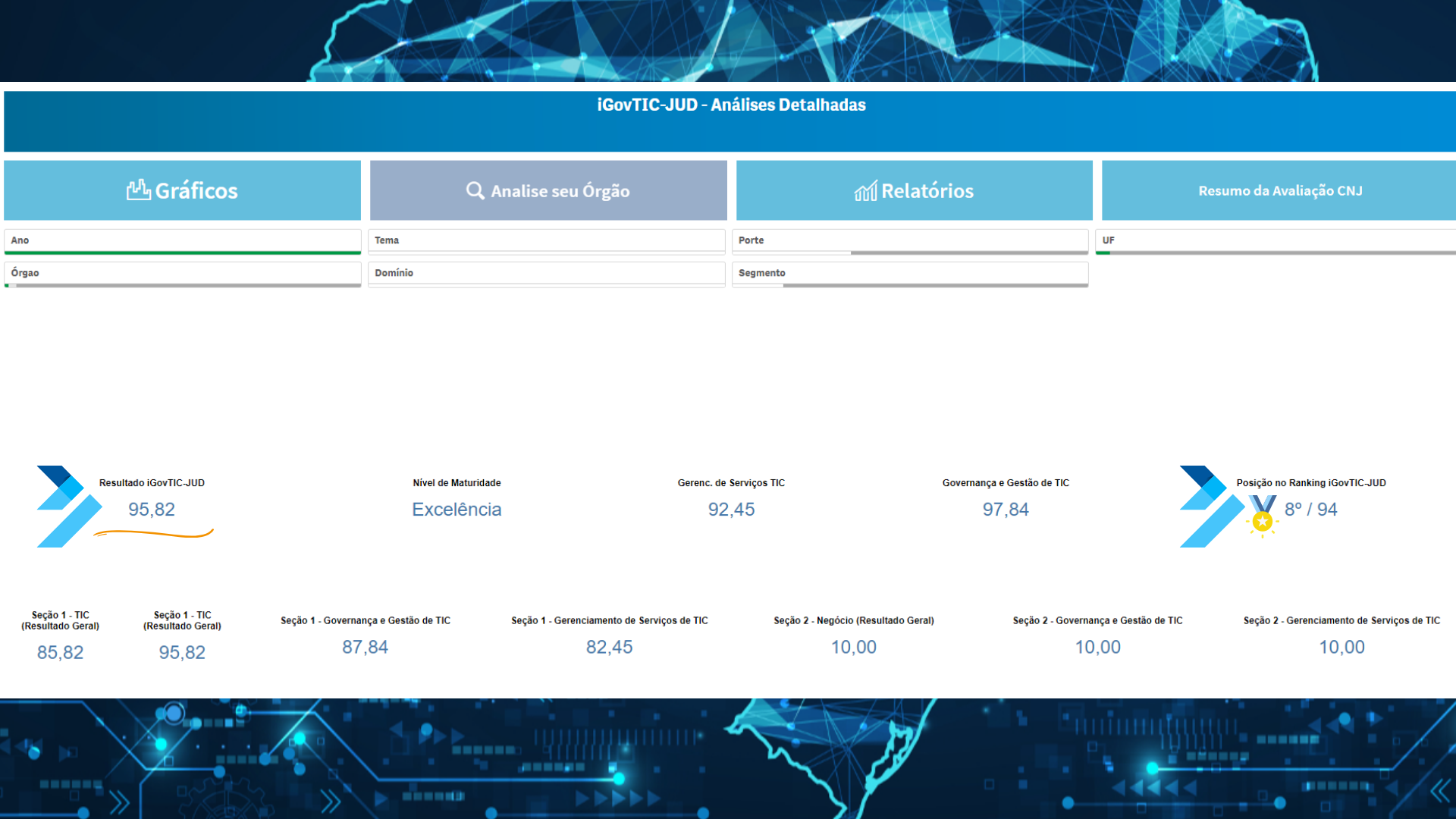 O Índice de Governança, Gestão e Infraestrutura de Tecnologia da Informação e Comunicação do Poder Judiciário (iGovTIC-JUD) é uma ferramenta que avalia a maturidade e competência em Tecnologia da Informação e Comunicação dos órgãos do Poder Judiciário. Esta análise tem como fundamento na Resolução CNJ 370/2021, que designa a Estratégia Nacional de Tecnologia da Informação e Comunicação do Poder Judiciário.
