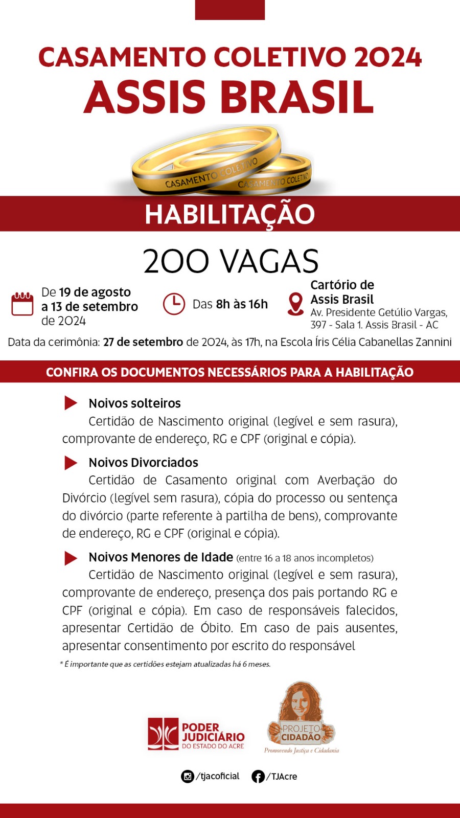 O Tribunal de Justiça do Acre, por meio do Projeto Cidadão, abriu as inscrições para o Casamento Coletivo, que será promovido no município de Assis Brasil. Os casais interessados em oficializar a união devem procurar o Cartório da cidade até 13 de setembro, das 8h às 16h, com todos os documentos exigidos para a habilitação. (veja abaixo)