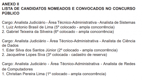 Foram convocados mais cinco analistas judiciários da área técnico-administrativa, sendo dois analistas de sistemas, dois analistas de Ciência de Dados e um analista de rede de computadores. Confira a lista: