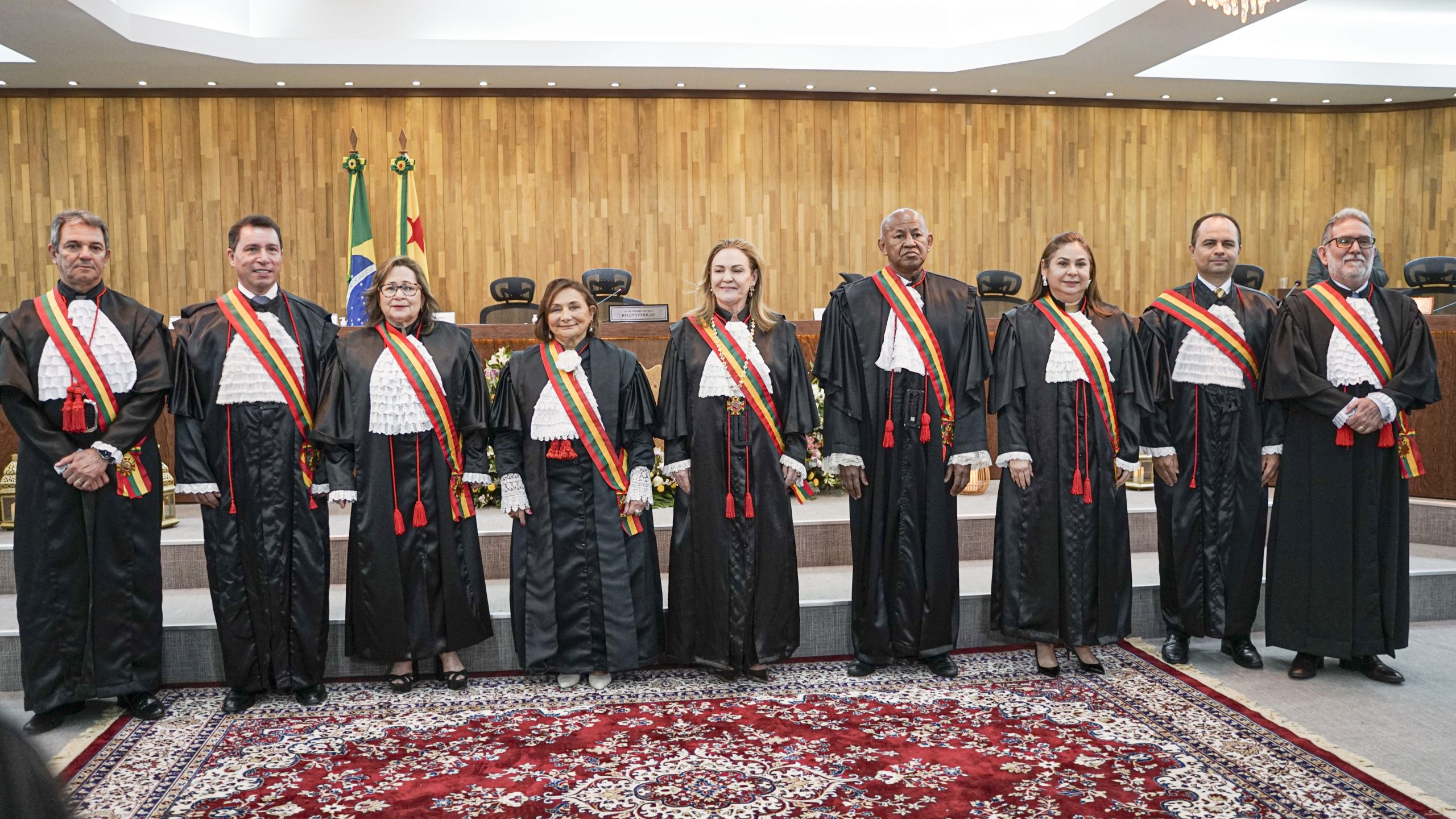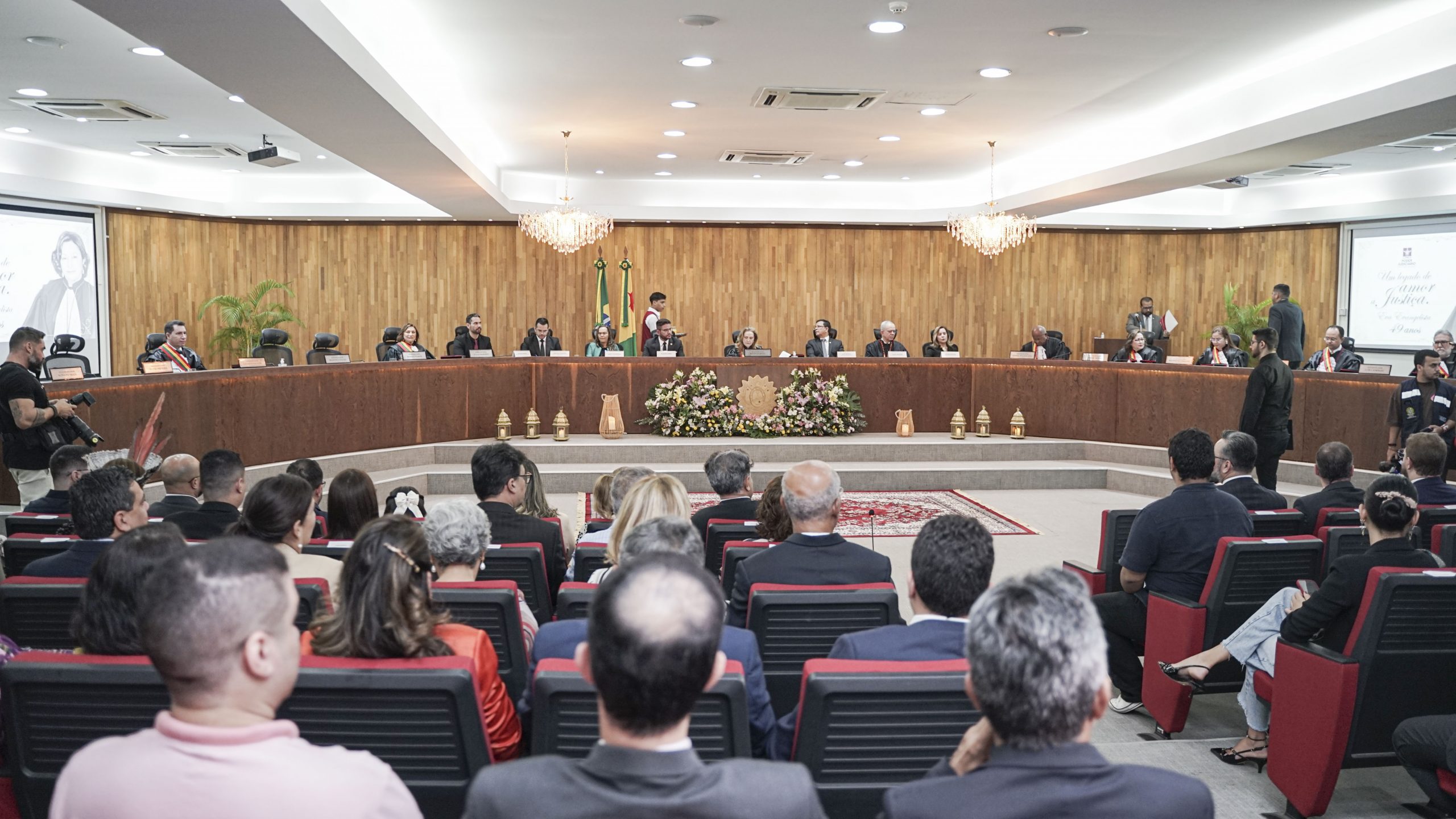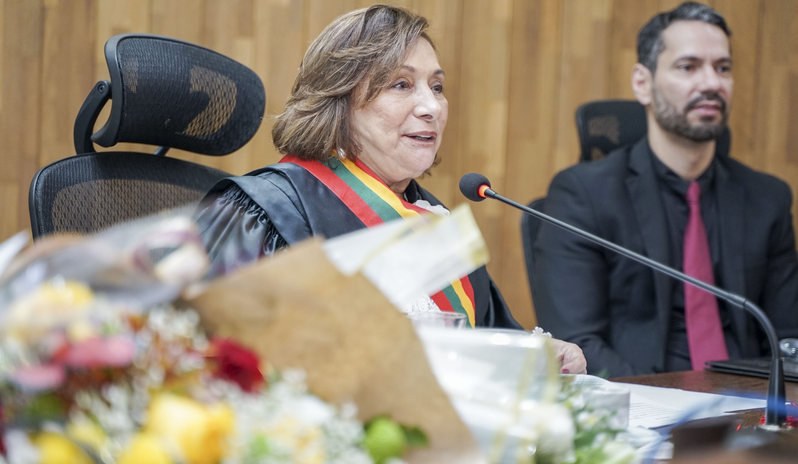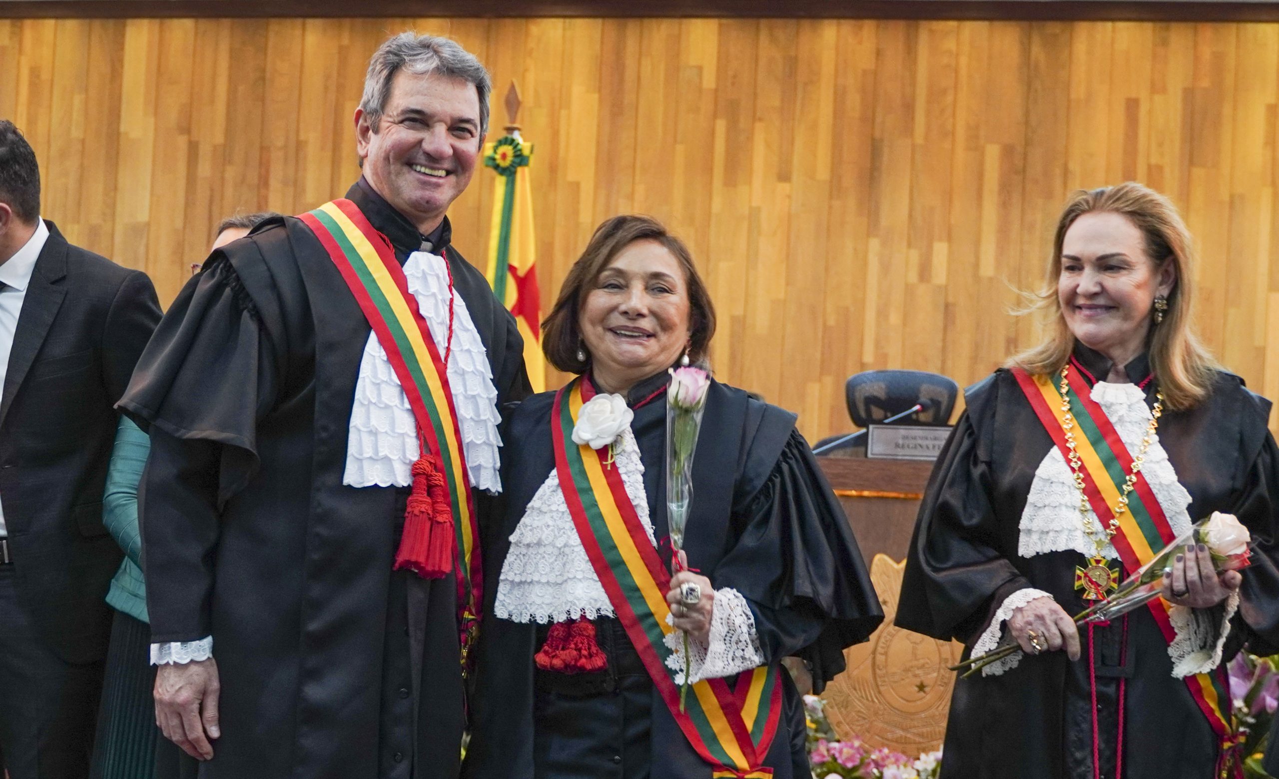 A sessão solene, conduzida pela desembargadora-presidente Regina Ferrari, contou com a presença das desembargadoras Denise Bonfim, Waldirene Cordeiro, bem como dos desembargadores Luís Camolez (vice-presidente do TJAC), Samoel Evangelista (corregedor-geral da Justiça), Júnior Alberto, Laudivon Nogueira e Nonato Maia, além da vice-presidente do Tribunal Regional do Trabalho da 14ª Região (TRT14), desembargadora do trabalho Maria Cesarineide (convidada de honra).