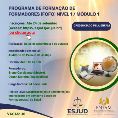 A Escola do Poder Judiciário do Acre (Esjud) abriu nesta segunda-feira (16) as inscrições para o Curso de Formação de Formadores (Fofo) Nível 1 / Módulo 1. O prazo segue até o dia 24 deste mês de setembro, com 30 vagas disponíveis.