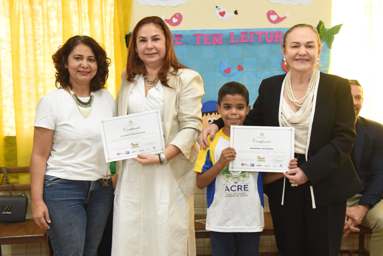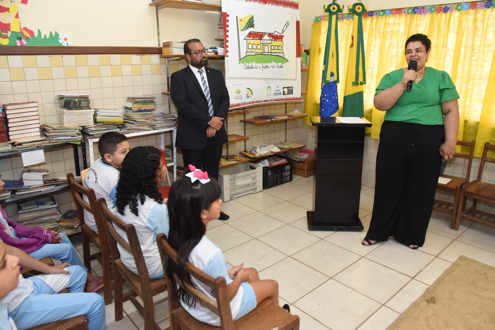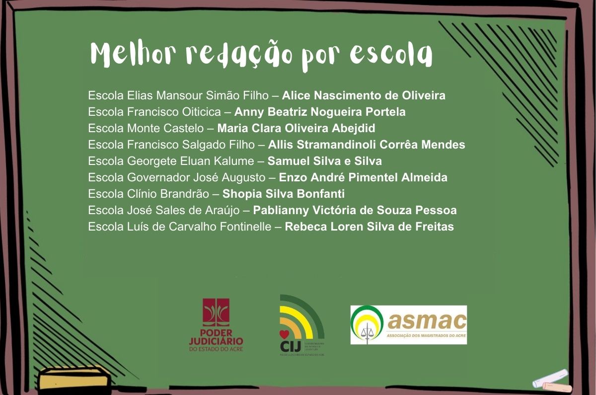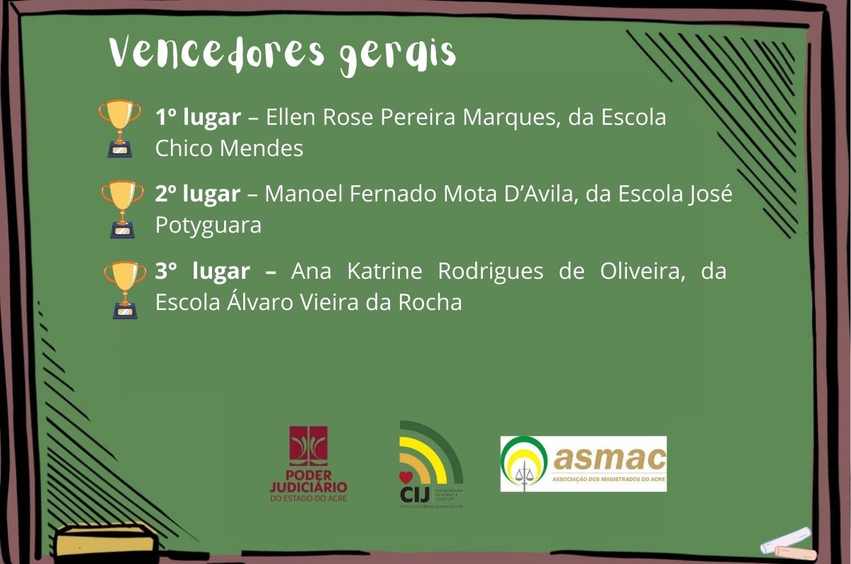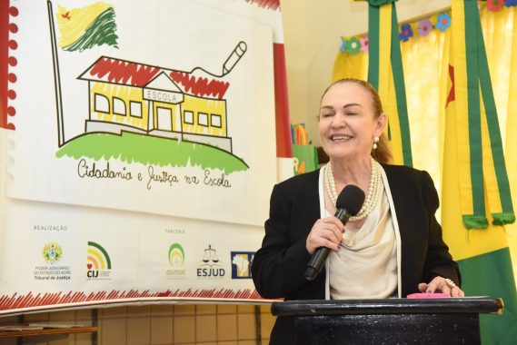 Estavam no dispositivo de honra da cerimônia de encerramento as desembargadoras Regina Ferrari (presidente do TJAC) e Waldirene Cordeiro (coordenadora da CIJ), o juiz de Direito Gilberto Matos (presidente da Asmac), o defensor público Celso Araújo e a diretora da Escola José Potyguara, Denise de Souza. Todas e todos conversaram com as crianças presentes sobre a importância de se dedicarem aos estudos, além de alertarem para necessidade de transformação das práticas, especialmente, nossas condutas em relação ao meio ambiente, para que tenhamos um futuro melhor.