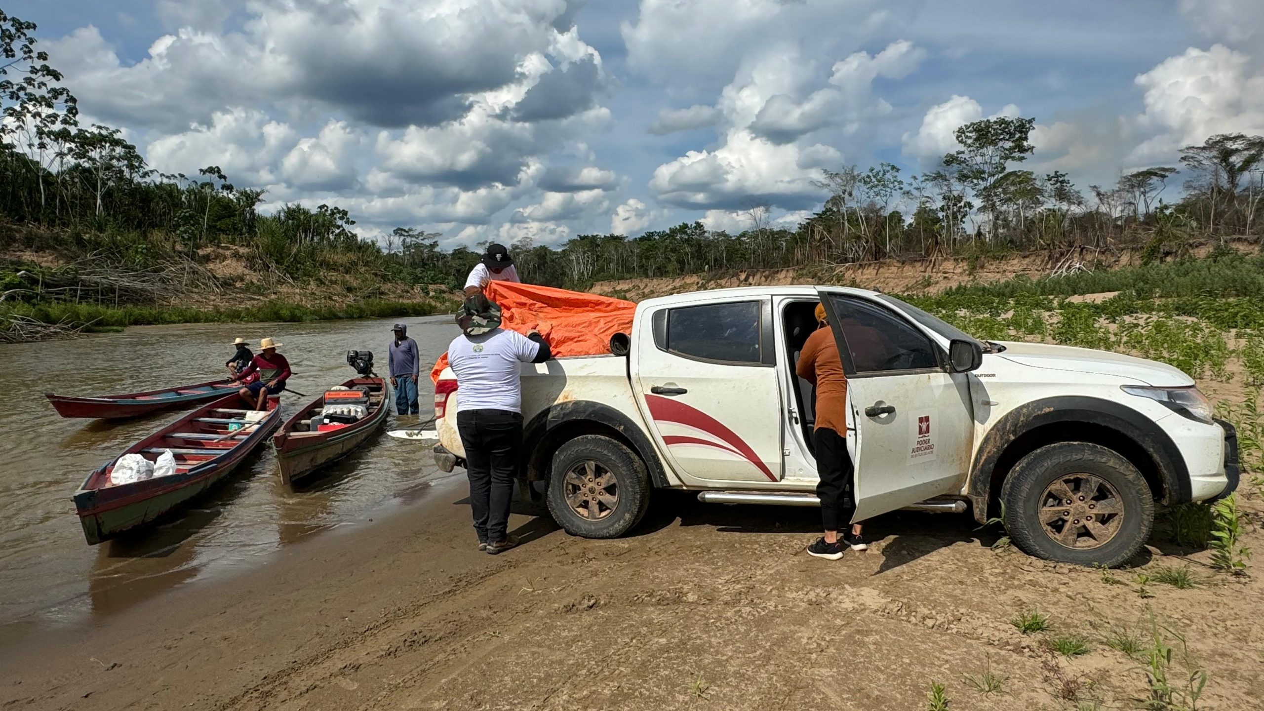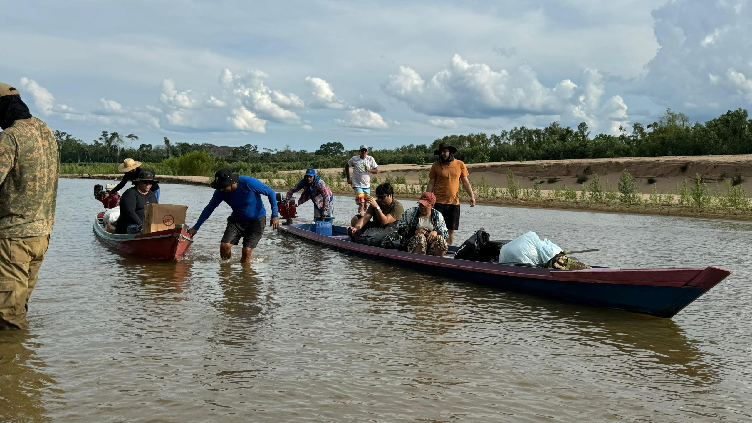 Com apoio da Defesa Civil de Assis Brasil, nove barcos transportaram as equipes e os materiais por 40 quilômetros até à aldeia Jatobá, na terra indígena Mamoadate. Devido à seca do rio, grande parte do trajeto foi feito a pé, empurrando as embarcações. Sob o céu estrelado, as equipes chegaram ao barranco de nove metros que dá acesso à aldeia.