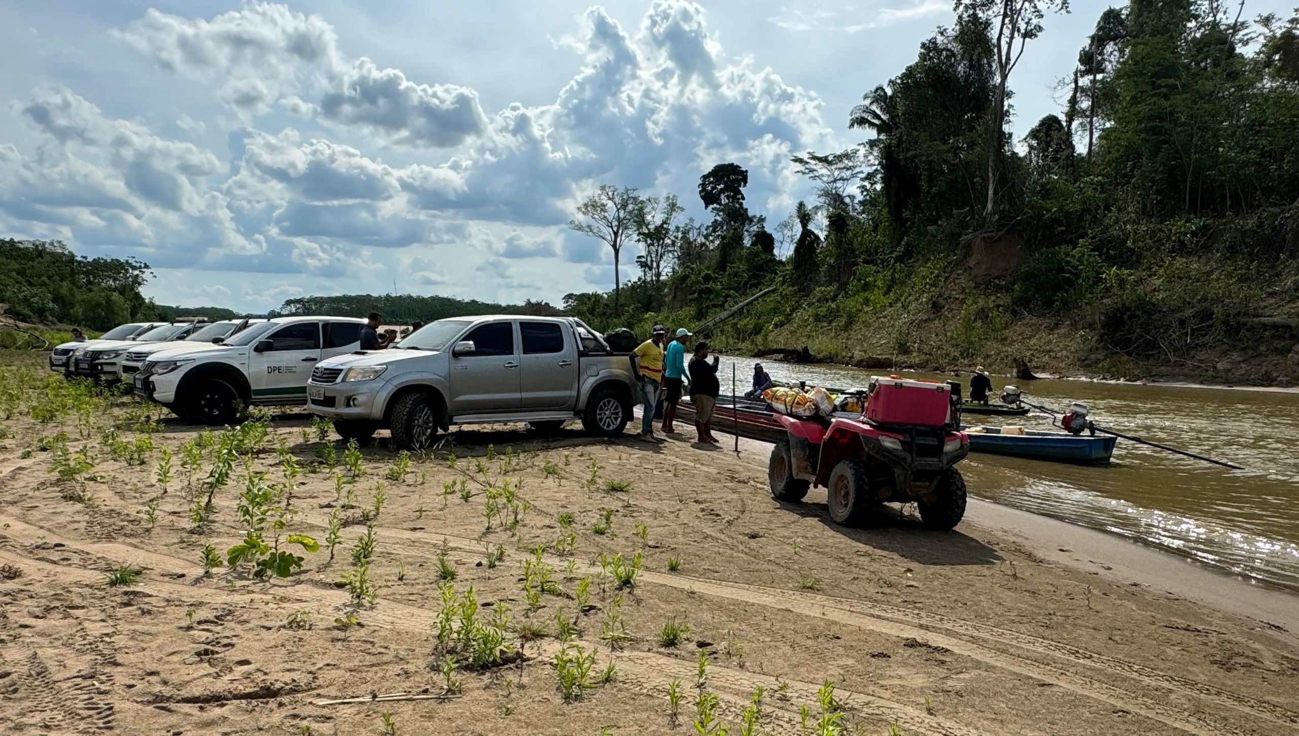 Após percorrer cerca de duas horas e meia entre ramais – estradas não pavimentadas -, abrindo e fechando porteiras em propriedades privadas, as equipes chegaram à Reserva Extrativista Chico Mendes. De lá, foram até o porto e embarcaram em barcos para subir o Rio Iaco. O percurso que deveria levar duas horas e meia, se estendeu para cinco horas em razão do baixo nível das águas.