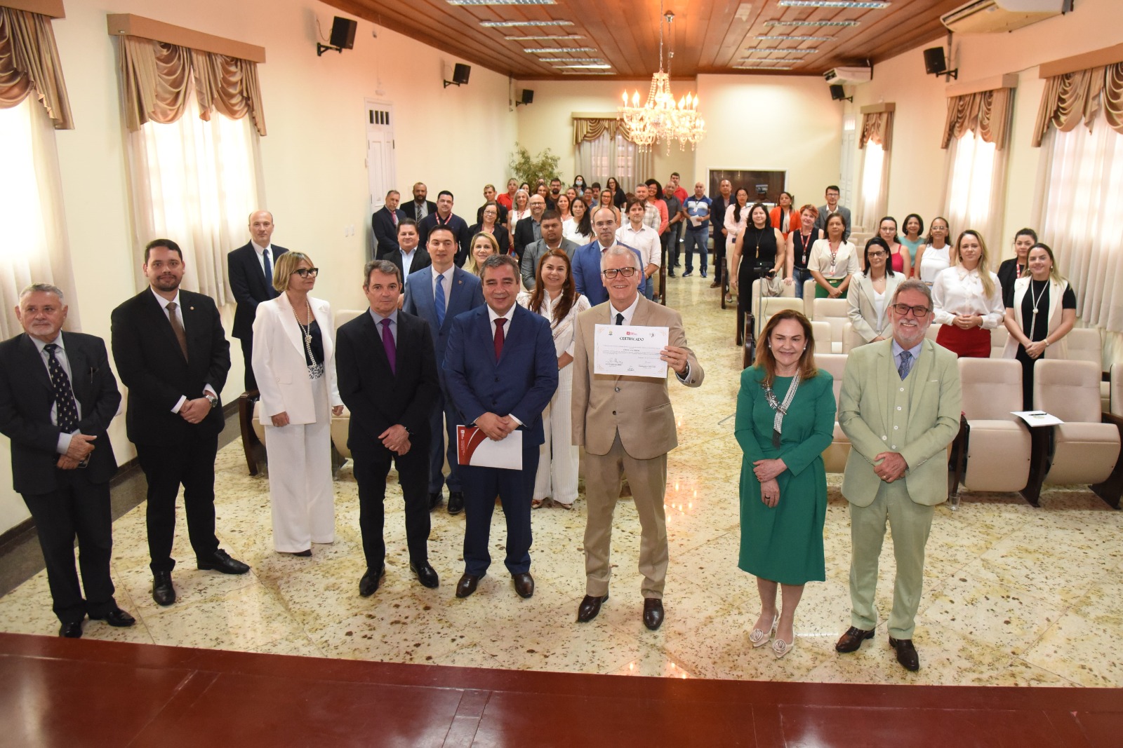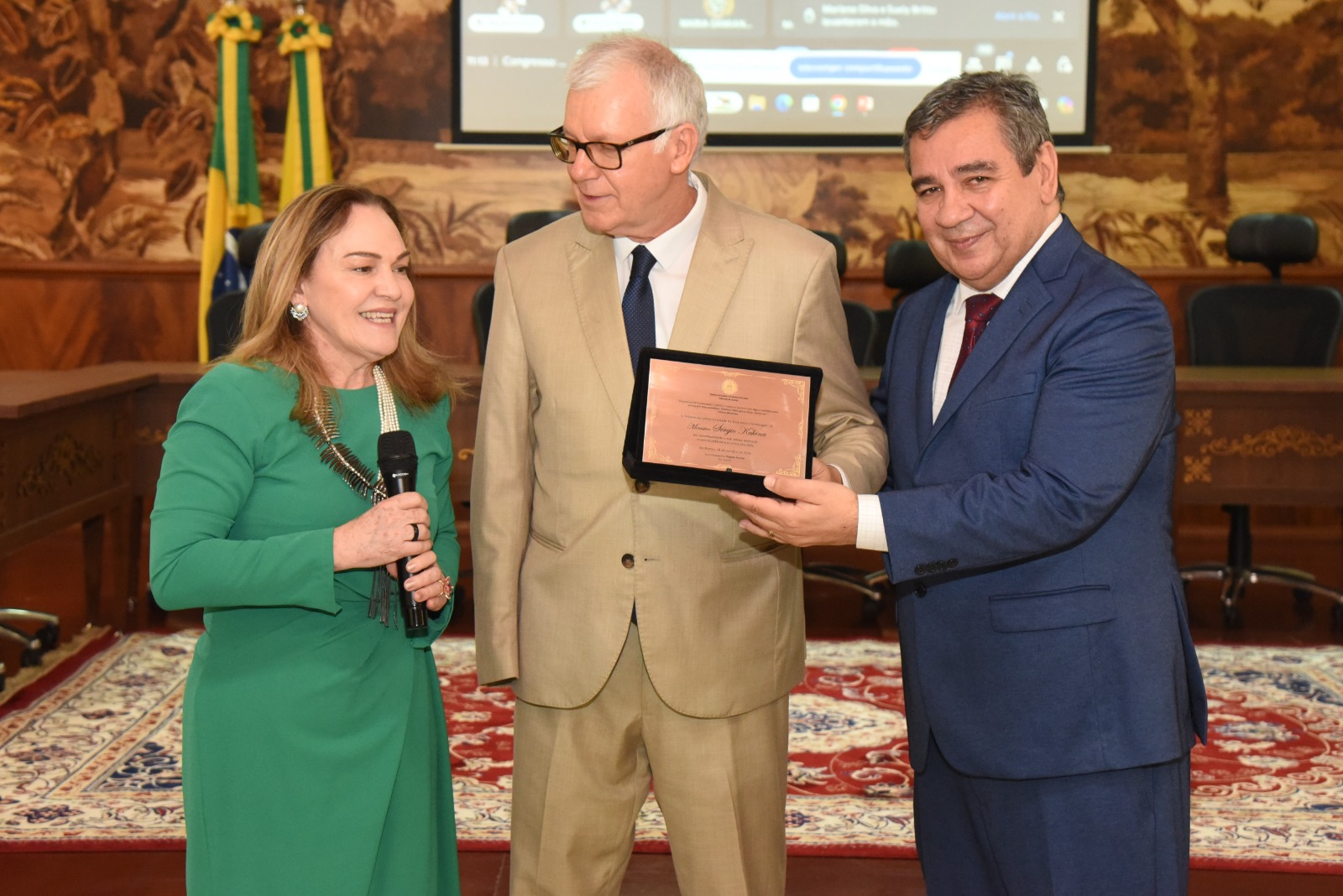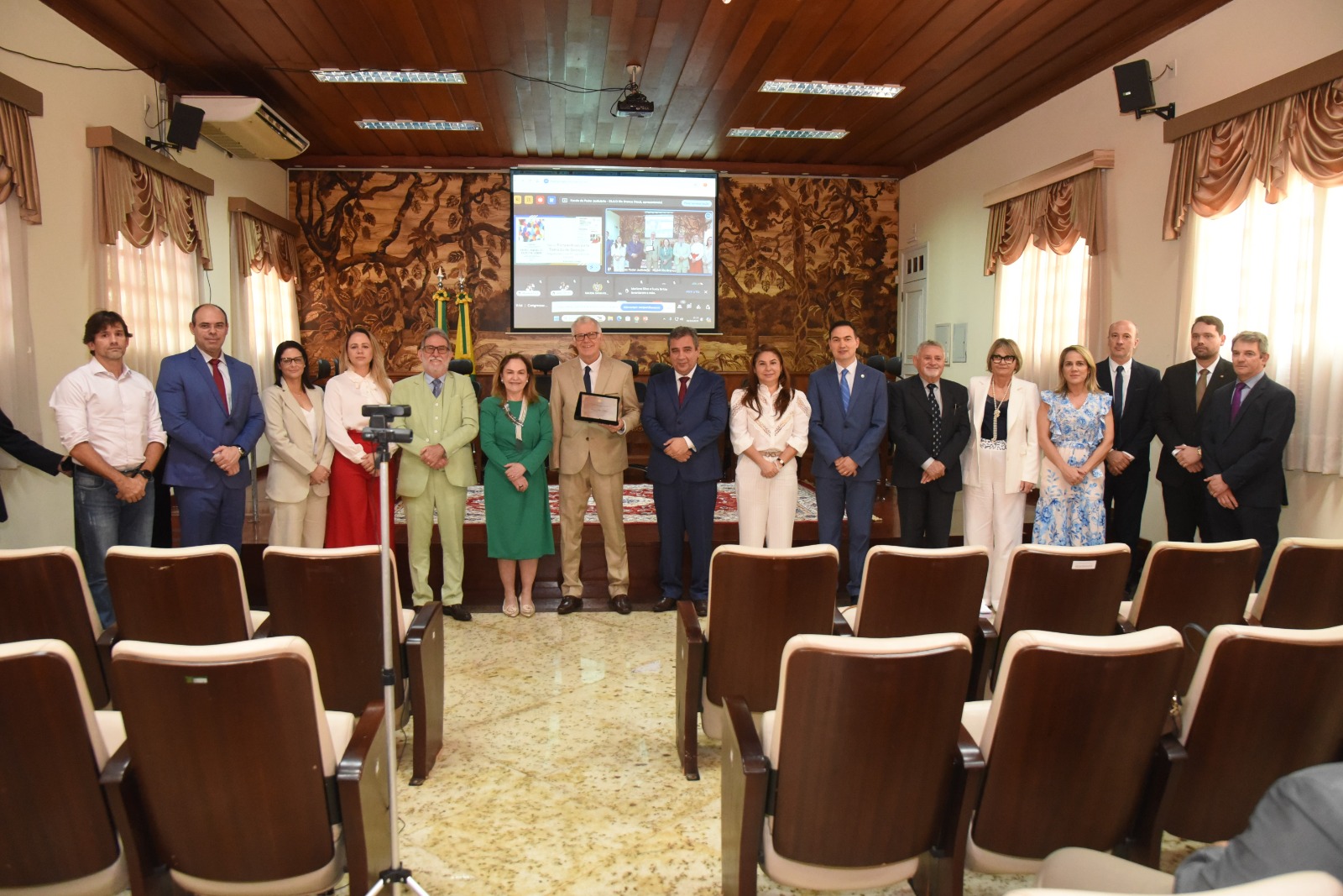Ao fim da exposição, o ministro Sérgio Kukina recebeu das mãos da presidente do TJAC e do diretor da Esjud uma placa de tributo pelos relevantes serviços prestados ao Poder Judiciário do Estado do Acre, juntamente com o certificado de participação no evento.