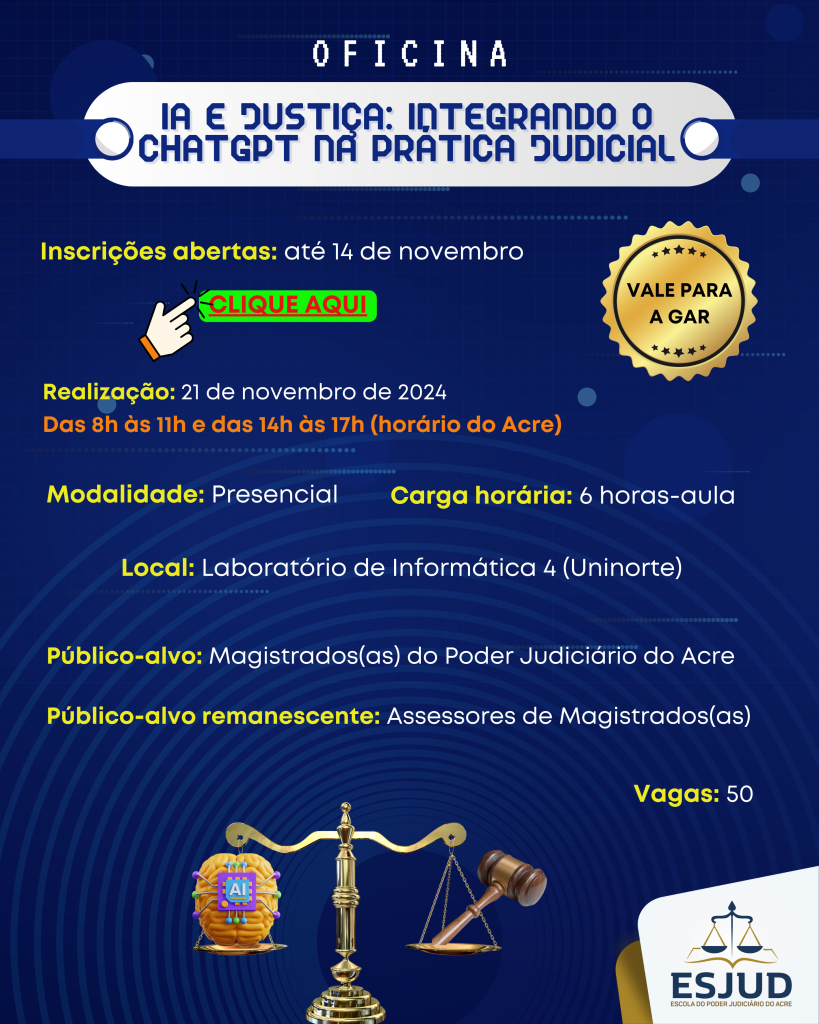 Em modalidade presencial, a oficina “IA e Justiça: Integrando o ChatGPT na Prática Judicial” acontece dia 21 de novembro (das 8h às 11h e das 14h às 17h) horário do Acre, no Laboratório 4 de Informática da Uninorte. O público-alvo é semelhante ao das capacitações acima. O formador será Esdras Benchimol, juiz titular da Vara de Crimes contra Vulneráveis da Comarca de Boa Vista e auxiliar da Presidência do Tribunal de Justiça de Roraima (TJRR). A oficina propiciará sugestão de perguntas em audiência, formulação de quesitos, mapeamento argumentativo, análise de discurso, uso do modo interpretativo para análise jurídica, elaboração automática de ementas, de minutas, estrutura do prompt etc.