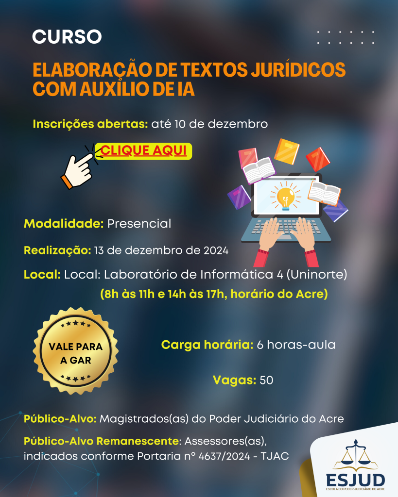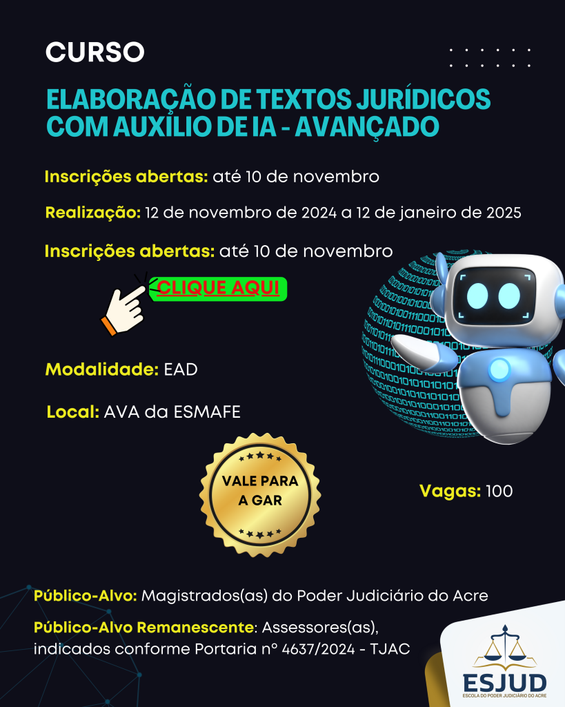 Para saber mais sobre o curso “Elaboração de Textos Jurídicos com Auxílio da Inteligência Artificial, acesse o Edital nº 144/2024.