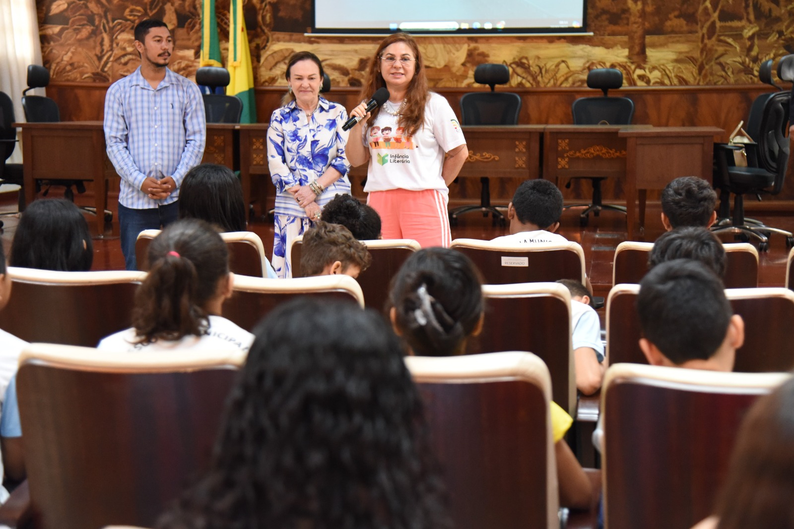 As heroínas e heróis, na faixa etária de 10 a 11 anos de idade e matriculados nas turmas da manhã e tarde do 5º ano, foram recebidos por um trio de mulheres sábias, a presidente do TJAC, desembargadora Regina Ferrari, a coordenadora da CIJ Waldirene Cordeiro e a juíza de Direito Andréa Brito (1ª vice-coordenadora da CIJ).