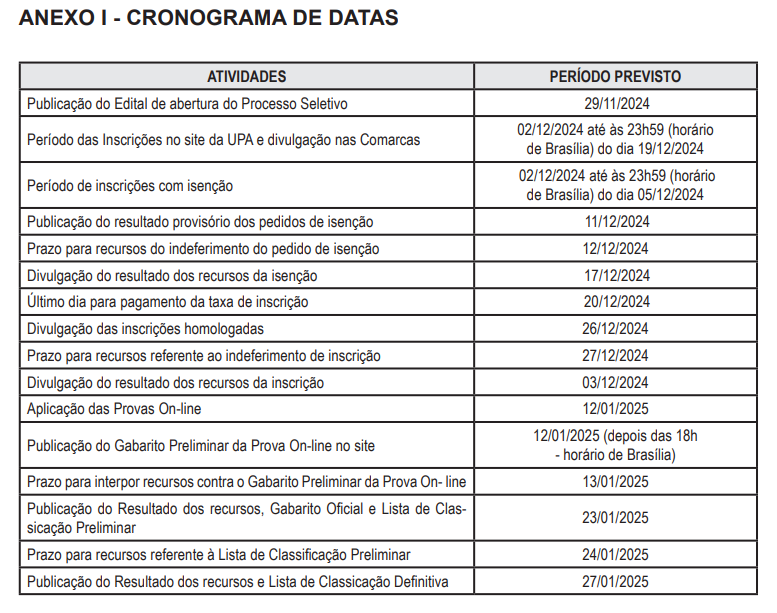 A prova objetiva on-line está prevista para o dia 12 de janeiro de 2025. O conteúdo programático está em anexo no edital, disponível na edição n° 7.672 do Diário da Justiça, desta sexta-feira, 29, a partir da página 78