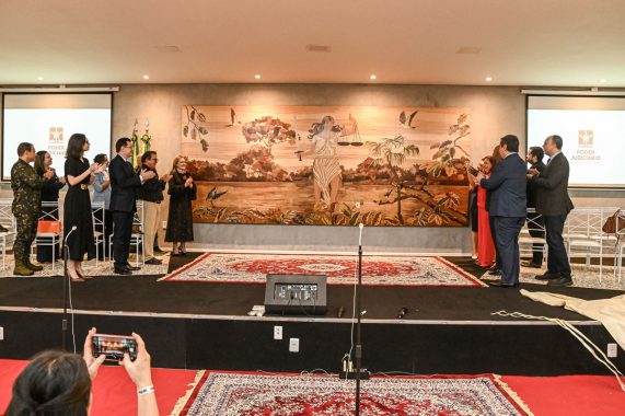 “Por meio de sua técnica refinada em marchetaria, utilizando as cores extraídas de árvores da nossa floresta e visão artística aguçada, o artista nos presenteia com uma representação que traduz força, equilíbrio e esperança, valores essenciais para o Judiciário. Além de embelezar o ambiente, esta criação inspira todos nós a continuar desempenhando, com dedicação, nossa missão de garantir justiça para a paz social”, completou a presidente.