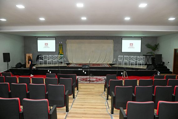No auditório, o ambiente foi completamente transformado com destaque para o escalonamento do piso, que garante melhor visibilidade e conforto durante os eventos. Além disso, o local agora conta com 124 novas poltronas, cuidadosamente instaladas para atender às normas de acessibilidade, incluindo assentos específicos para pessoas obesas, com áreas frontais para cadeirantes, assegurando inclusão e respeito às necessidades de todos.