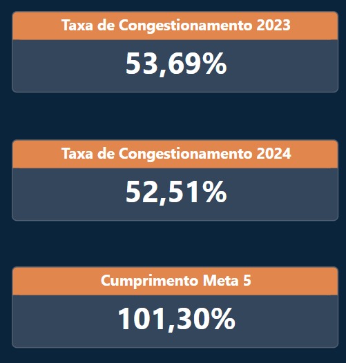 A taxa de congestionamento reduziu de 53,69% em 2023 para 52,51% em outubro de 2024. Além da Meta 5, há um item específico no Prêmio CNJ de Qualidade relativo à Taxa de Congestionamento do eixo Produtividade.
