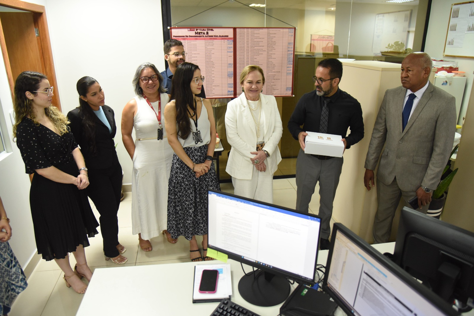 As felicitações se iniciaram na 5ª Vara Cível, onde foi recebida pela juíza Shirlei Hage. Em seguida, na 4ª Vara Cível com o juiz Marcelo Carvalho, que em breve assumirá uma nova unidade. Ao chegar na 3ª Vara Cível, foi notada a dedicação da equipe do juiz Leandro Gross, pois nas paredes haviam banners específicos para o “check” dos processos contemplados pela Meta 2 (que trata de reduzir estoque de processos antigos) e sobre a transparência.