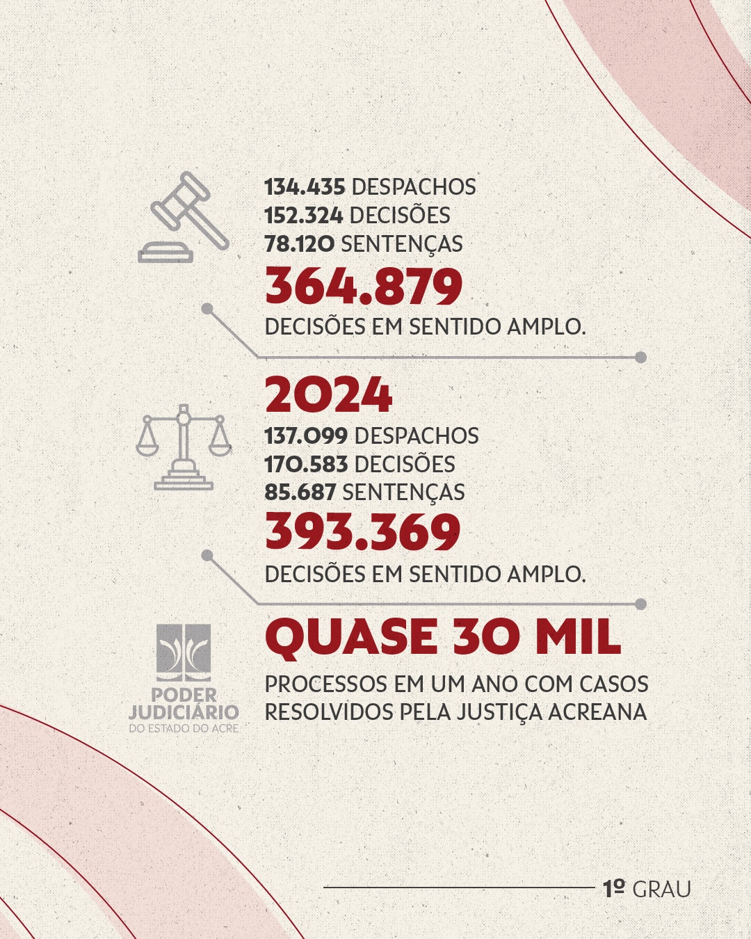 De acordo com o balanço da Corregedoria-Geral da Justiça (COGER), o Primeiro Grau do Poder Judiciário acreano registrou crescimento de quase 30 mil processos entre 2023 e 2024, o que corrobora a melhoria na resolutividade dos casos apresentados à Justiça. Em 2023, foram 364.879 decisões ao passo que, em 2024, foram 393.369 decisões, o que demostra o aumento significativo.