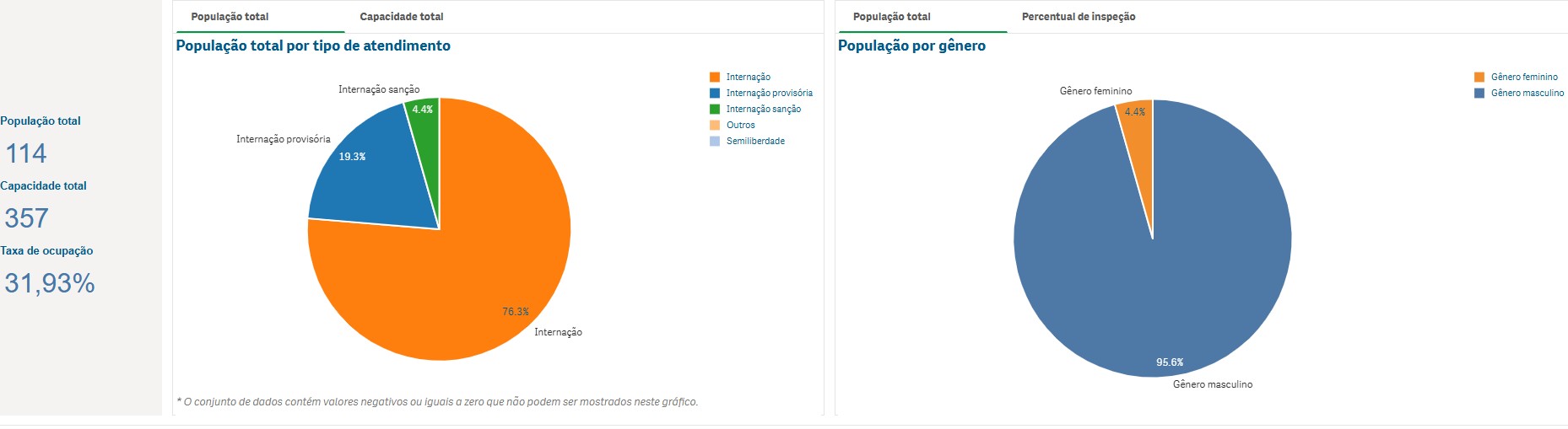 Os dados mais recentes, referentes às inspeções judiciais realizadas entre setembro e outubro de 2024 apresentados pelo Painel de Inspeções no Socioeducativo, recém lançado pelo Conselho Nacional da Justiça (CNJ) e que apresenta dados nacionais em formato inédito sobre o sistema que recebe adolescentes e jovens a quem se atribui a prática de ato infracional, apontam que a taxa de ocupação das oito unidades socioeducativas inspecionadas está com 114 adolescentes internados da capacidade total de 357, o que equivale apenas 31,93% da taxa de ocupação.