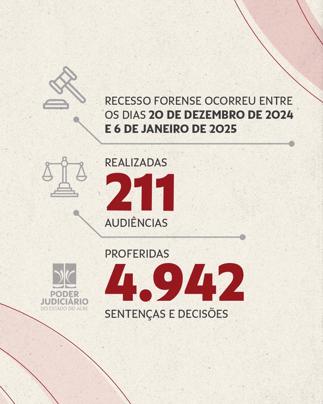 Os dados preliminares mostram que, ao todo, foram realizadas 211 audiências e proferidas 4.942 sentenças e decisões durante o plantão judicial que acompanha o recesso forense. Merecem destaque a realização, pela Presidência do TJAC e a Corregedoria-Geral da Justiça de um mutirão de audiências promovido durante o período, bem como a contratação de 20 estagiários e estagiárias no último mês de dezembro. Os estudantes participaram das ações realizadas pelo juiz de plantão, no âmbito do Projeto Mariri. A atividade, que teve como formadoras as servidoras Lisli Paula e Maria Ivandione, foi focada na obtenção de experiência prática em processo civil. Os estagiários atuaram na expedição de mandados, cartas, certidões e publicações de atos judiciais e no cumprimento das decisões judiciais, entre outros.
