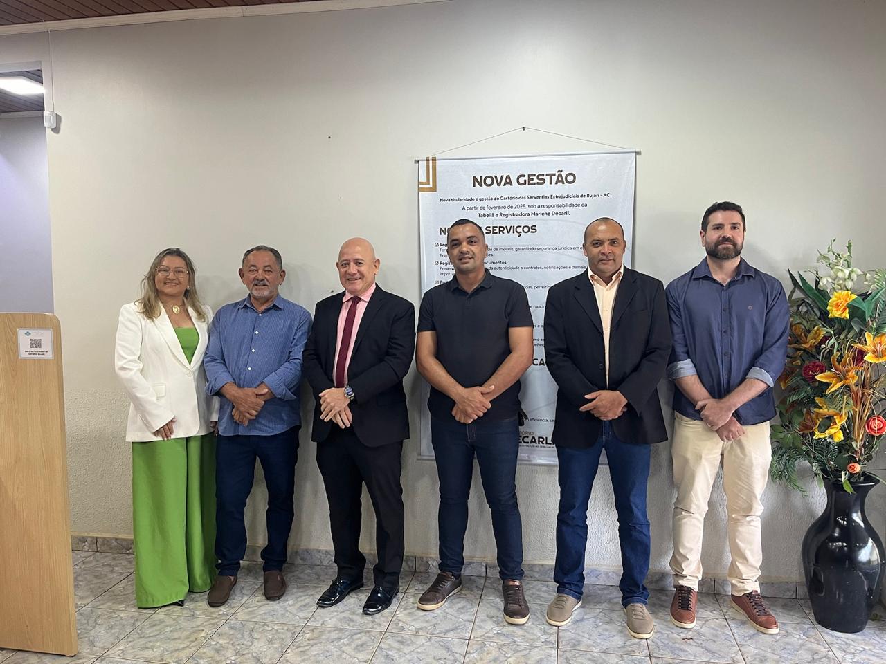 À exemplo da agenda realizada, o juiz Manoel Pedroga também deu as boas-vindas a delegatária Marlene Decarli, que assinou a sua entrada em exercício no Tabelionato de Notas, Tabelionato de Protesto de Títulos, Ofícios do Registro Civil das Pessoas Naturais, do Registro de Imóveis e do Registro de Títulos e Documentos e das Pessoas Jurídicas da Comarca de Bujari. O prefeito de Bujari, João Padeiro, também participou do ato.