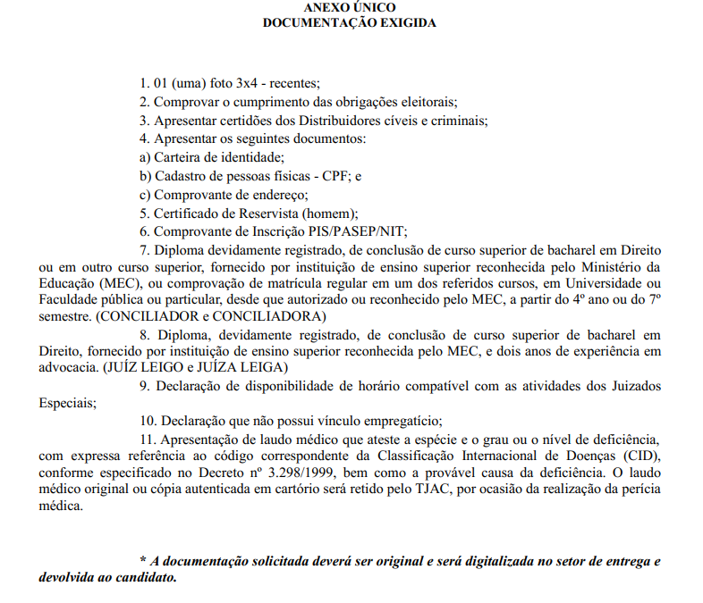Todos devem apresentar a seguinte documentação presencialmente (na Gerência de Desenvolvimento de Pessoas, situado na sede administrativa do TJAC) no prazo de cinco dias úteis: