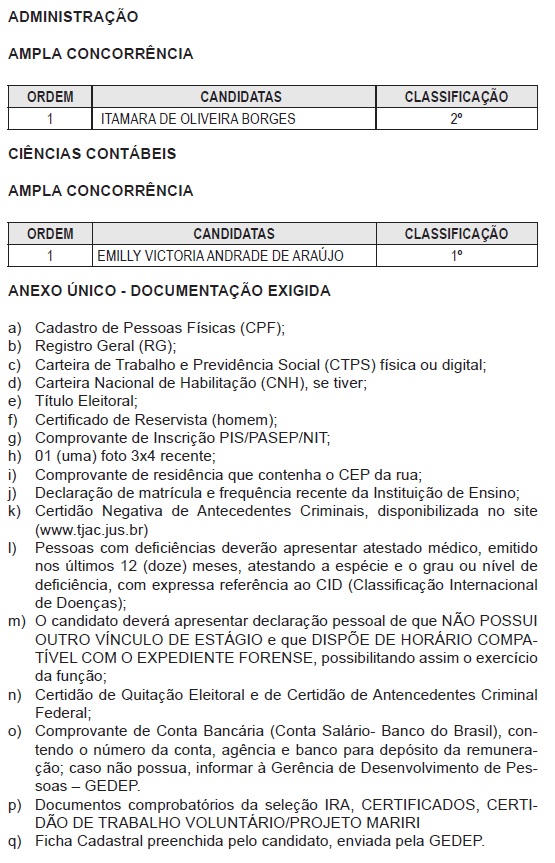 Duas estudantes foram chamadas, uma da área de Administração e outra de Ciências Contábeis. Elas têm cinco dias úteis para enviar a documentação exigida ao e-mail gedep@tjac.jus.br