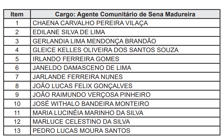 Foram considerados aprovados todos que obtiveram 50% do somatório da pontuação correspondente à análise do currículo. Portanto, foram 18 aprovados em Sena Madureira, veja a lista: