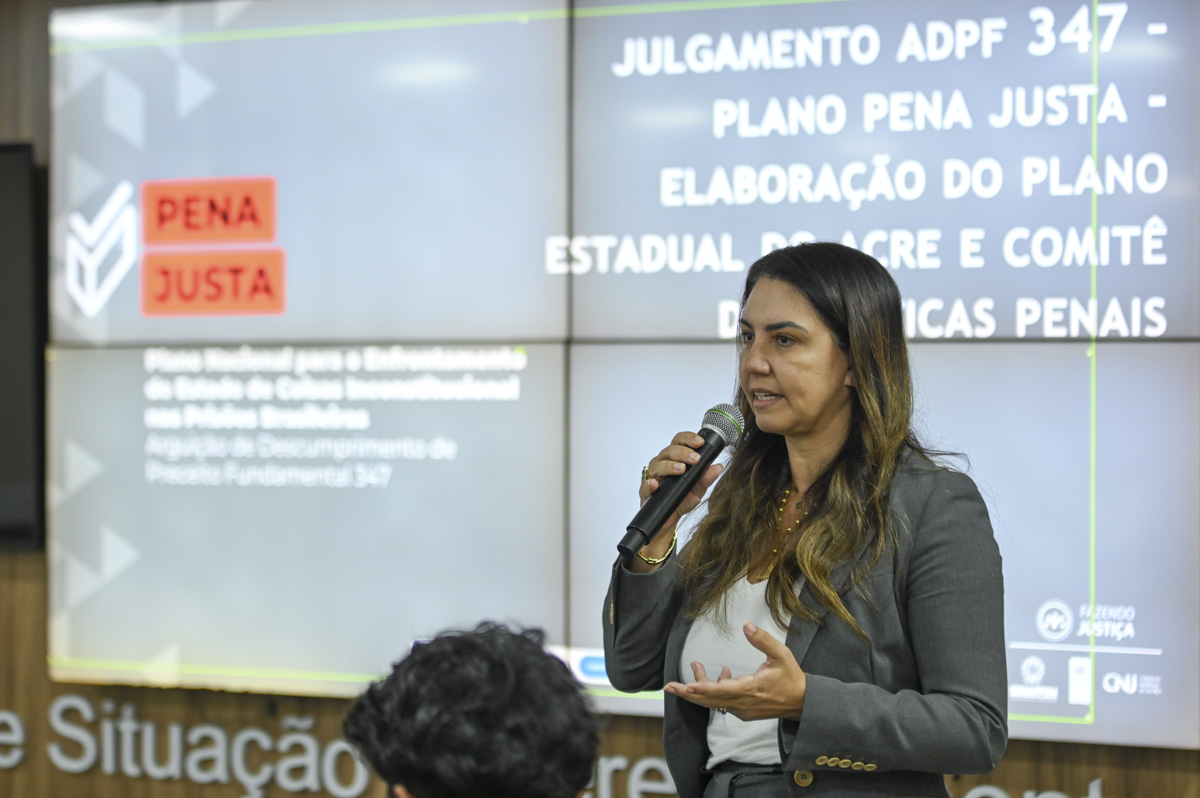 A apresentação do plano Pena Justa foi feita pela juíza de Direito Andréa Brito, coordenadora do GMF, e pela assistente técnica do CNJ, Rúbia Evangelista. O plano é uma ação estruturada a nível nacional com participação social, para lidar com a crise no sistema prisional brasileiro.