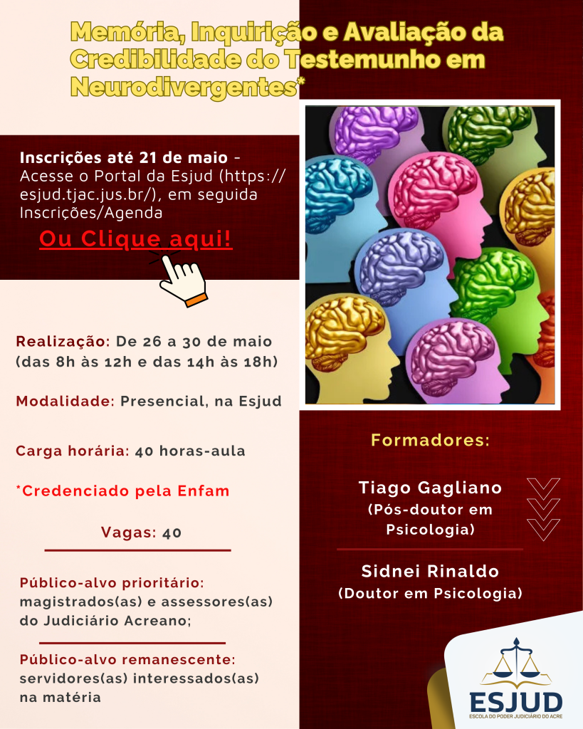 A Escola do Poder Judiciário do Acre (Esjud) abriu as inscrições para o curso “Memória, Inquirição e Avaliação da Credibilidade do Testemunho em Neurodivergente”. O prazo de inscrição segue até o dia 21 de maio; já as atividades presenciais ocorrerão entre os dias 26 e 30 deste mês, na sede do órrgão de ensino, sempre das 8h às 12h e das 14h às 18h.