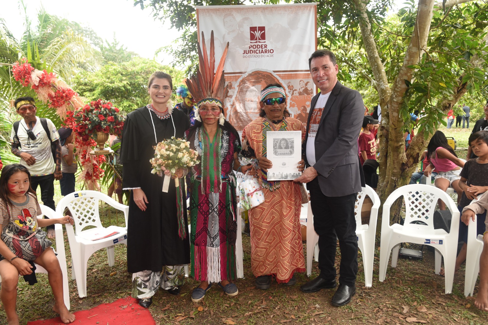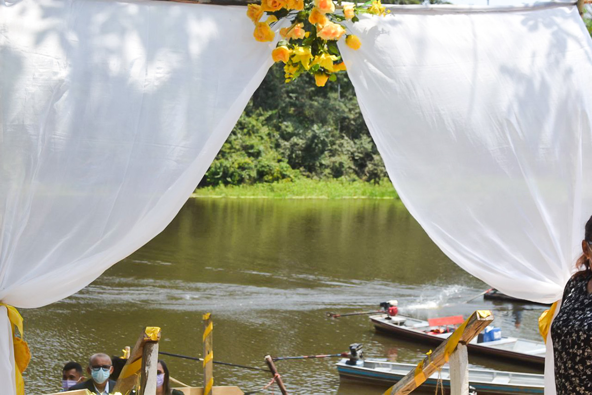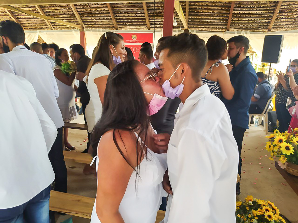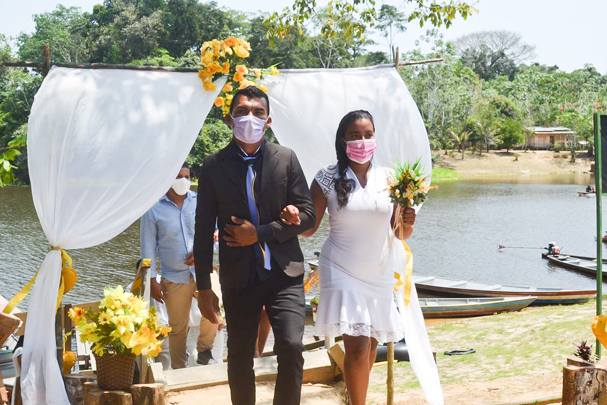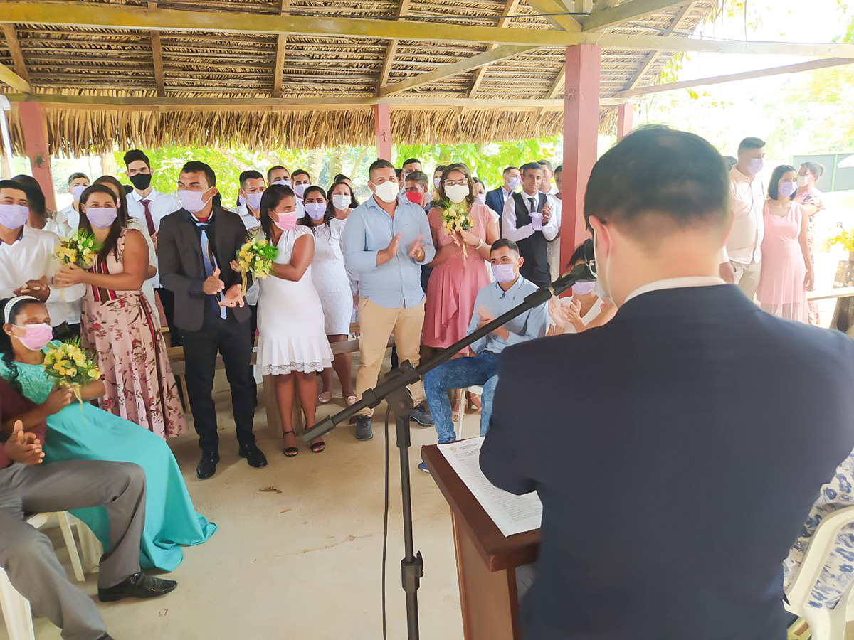 “Na hora”, respondeu Boinawa Huni Kuin, 53 anos, para a pergunta: “É de livre e espontânea vontade que o senhor recebe sua noiva, Maria Macambira, como legítima esposa?”. Ele ainda deu uma joia para confirmar. Quando ele terminou de falar, desembargadores, juíza, autoridades e todas as pessoas presentes riram com o jeito próprio do indígena em dizer sim, para a oficialização da união, durante a cerimônia do Casamento Coletivo, realizado no último dia 28 de maio, na Aldeia São Vicente, na Terra Indígena Huni Kuin do Rio Humaitá.