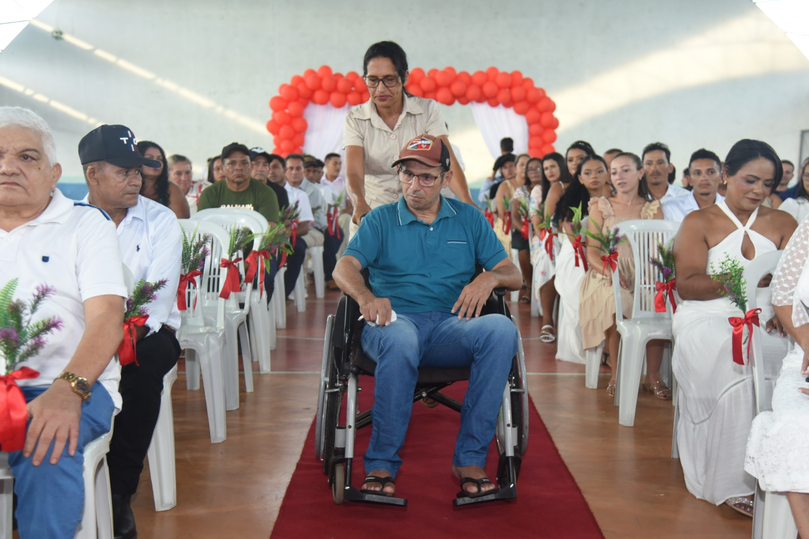 Com cuidado e capricho as equipes do Judiciário do Acre com as parceiras e parceiros preparam os Casamentos Coletivo, decorando, providenciando cenário para fotos e, às vezes, arrumando até bolo para as noivas e noivos. No seringal paraíso, em abril de 2023, onde a estrutura não era muito grande, uma parceira fez o bolo na pequena cozinha da casa que servia de suporte para a equipe que estava trabalhando nos atendimentos. Ela ficou pegada na missão, varando a noite confeitando.